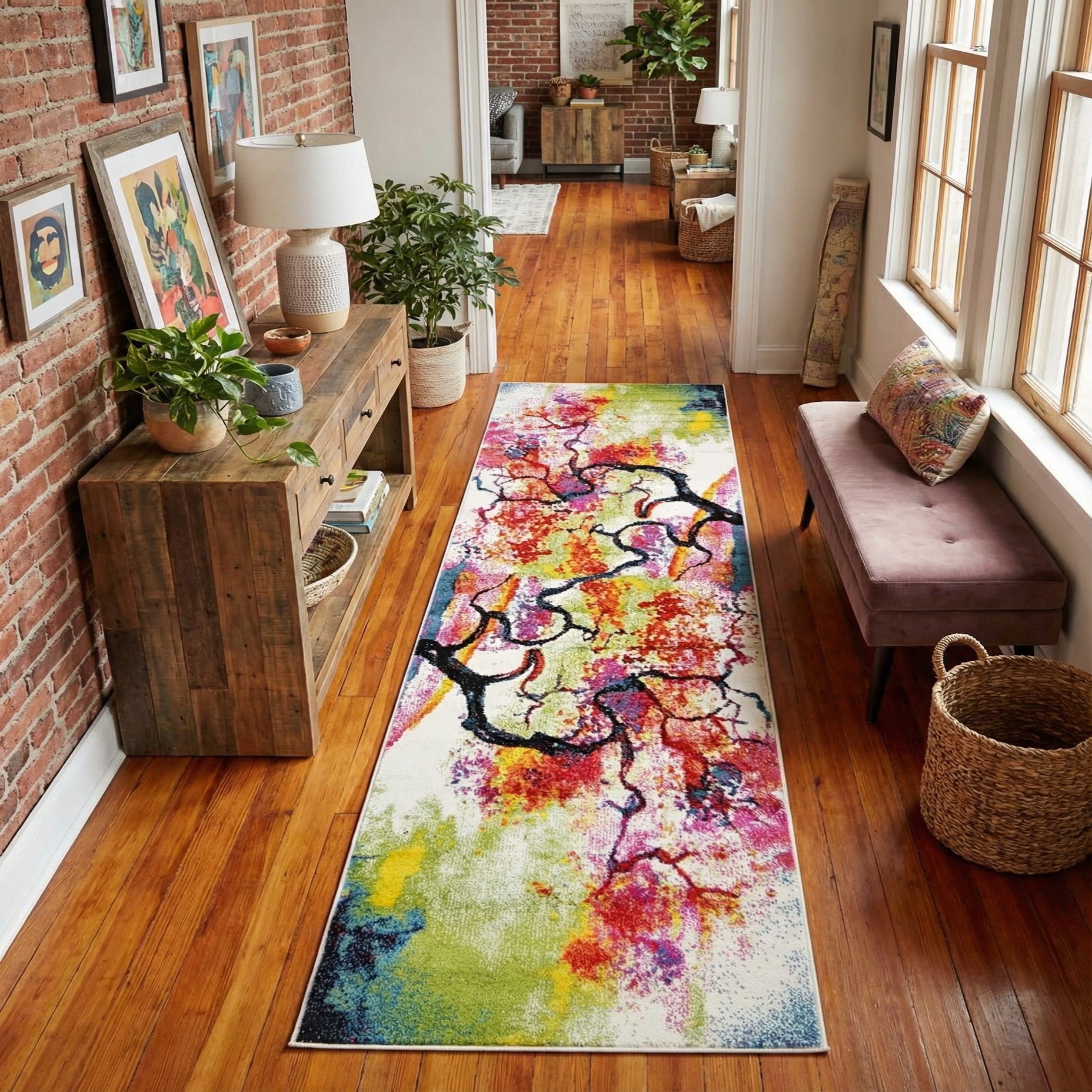 Machine made of 100% polypropylene, this runner combines the look of contemporary art with practical construction. It brings instant energy to narrow spaces such as hallways, entryways, or alongside a kitchen run and pairs beautifully with light wood floors and neutral walls for a modern contrast. Use it to add a focal stripe of color to a minimalist room, complement mid-century furnishings with a playful layer, or anchor a gallery-style corridor beneath a console table.