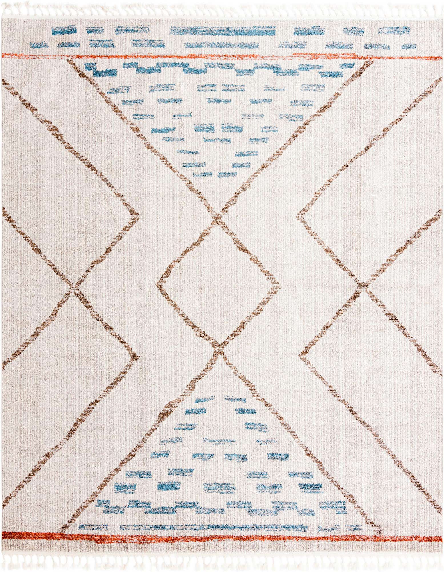The Aramis Collection offers a 10 Ft Square rug, crafted with precision through machine weaving techniques and made from durable polypropylene. This piece presents a modern take on geometric design, featuring a series of diamond motifs in a tasteful arrangement. The color palette combines ivory as the primary background shade, with thoughtful injections of blue, brown, gray, light blue, and terracotta for a balanced and visually engaging aesthetic.