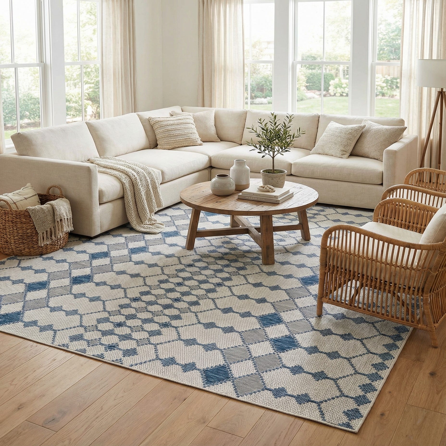 Featuring a crisp ivory background, the rug is accented with a tasteful lattice pattern that intertwines shades of blue and gray. The stain-resistant nature of the material ensures easy maintenance, while the pet-friendly design makes it an excellent choice for animal lovers. The shed-free quality guarantees a consistent look without the need for frequent cleaning.