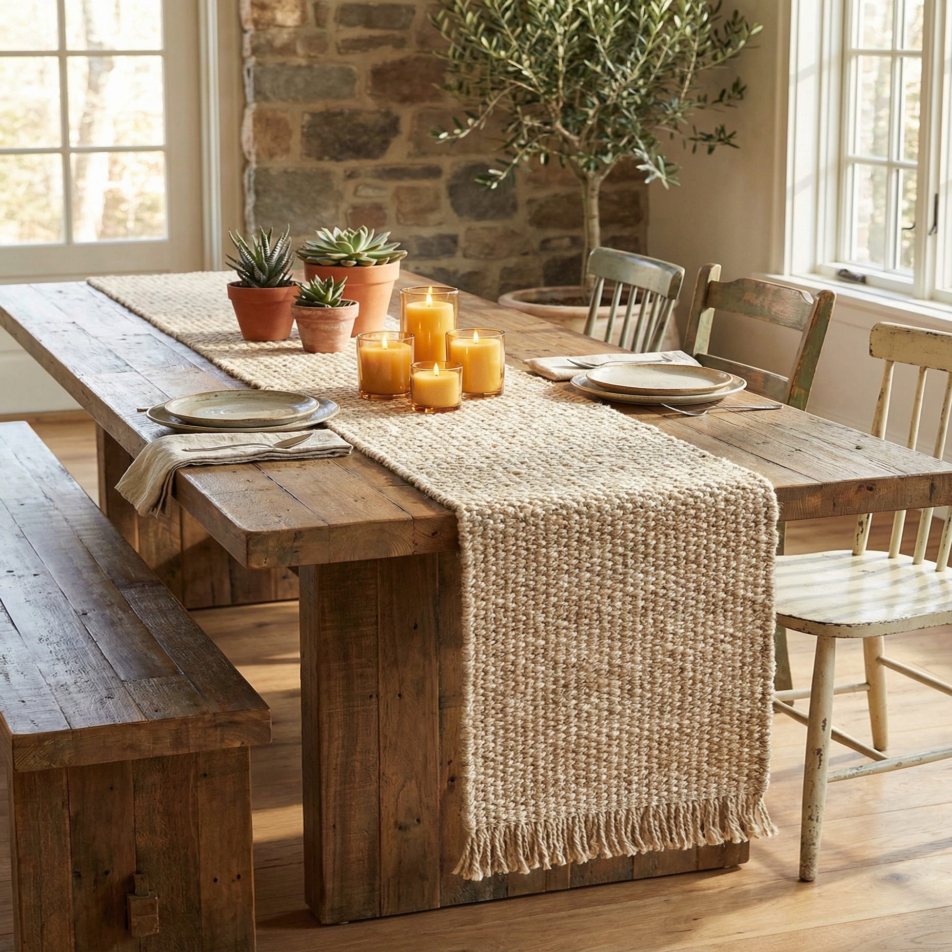 This runner works well in relaxed, modern spaces as well as farmhouse, coastal, or Scandinavian-inspired interiors. Lay it down the center of a dining table or use it on a console or kitchen island to introduce texture without competing with patterned tableware; it pairs naturally with light woods, linen napkins, ceramic dishes, rattan accents, and layered neutrals.