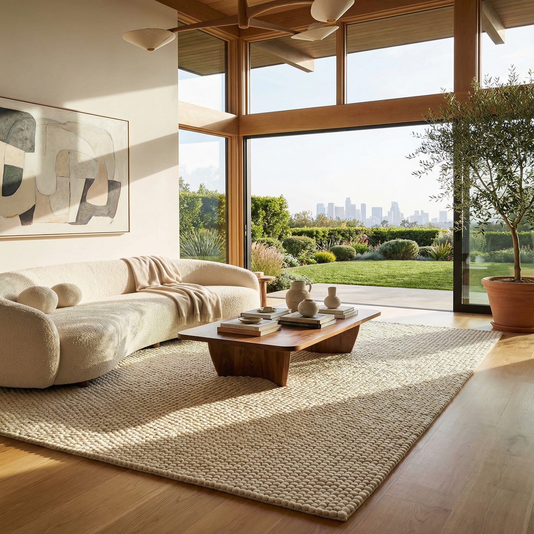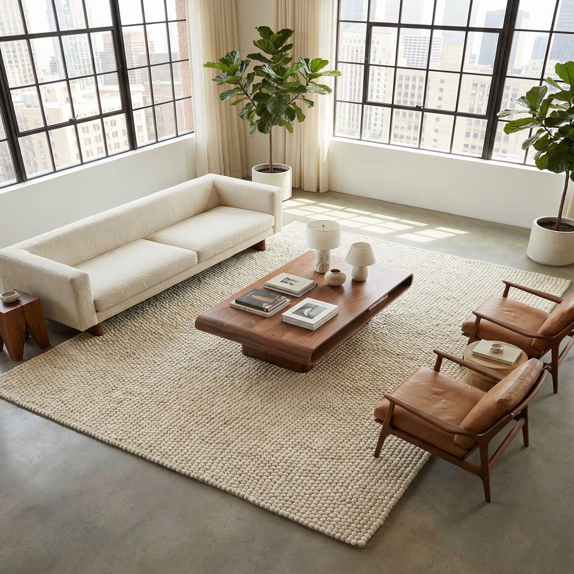 Place this hand made of 100% wool piece beneath a low-profile sofa and coffee table to anchor a living area, layer it at the foot of a bed to add warmth and texture to a bedroom, or use it to soften a dining space with light wood furniture. It pairs naturally with Scandinavian, coastal, or modern farmhouse schemes and works well alongside linen upholstery, natural wood finishes, and neutral color palettes where texture is the primary design element.