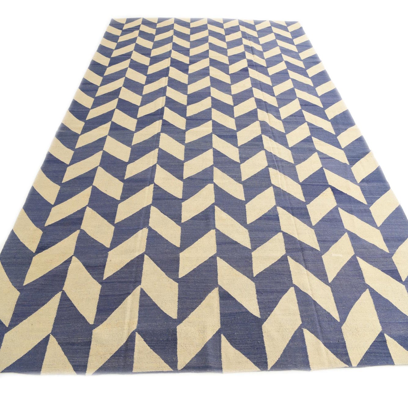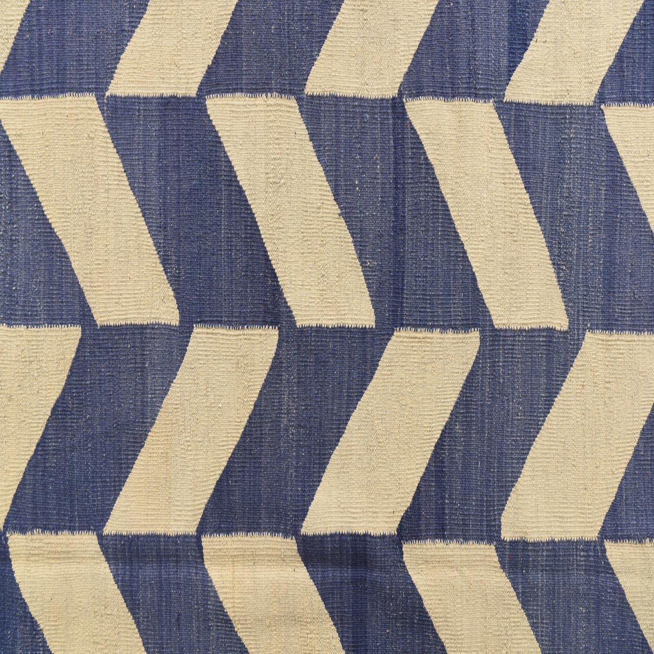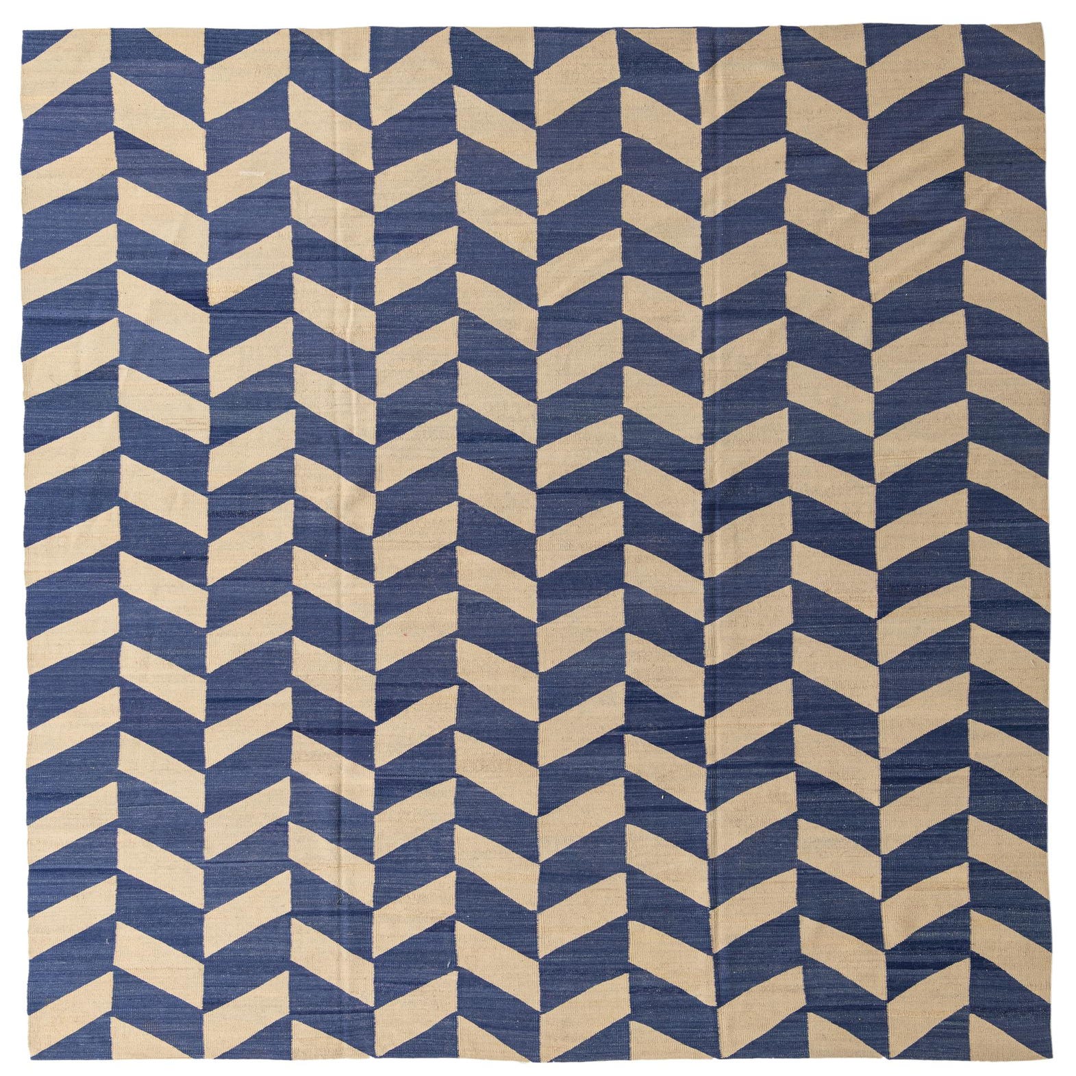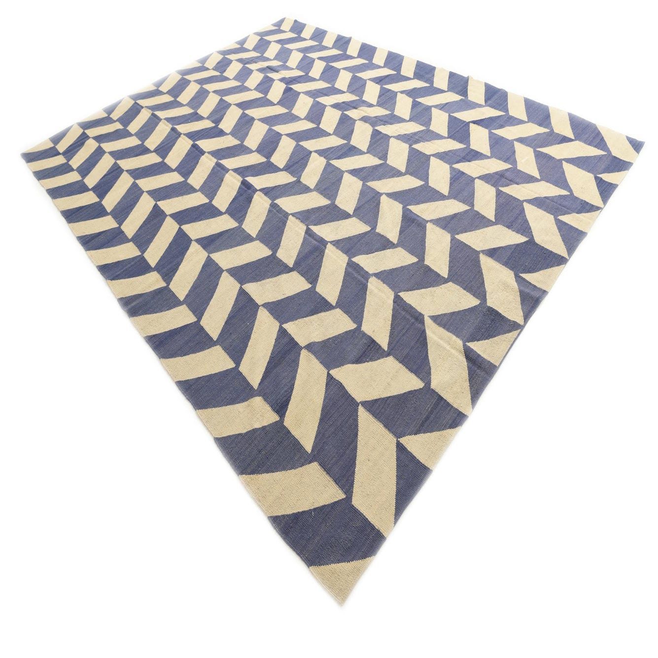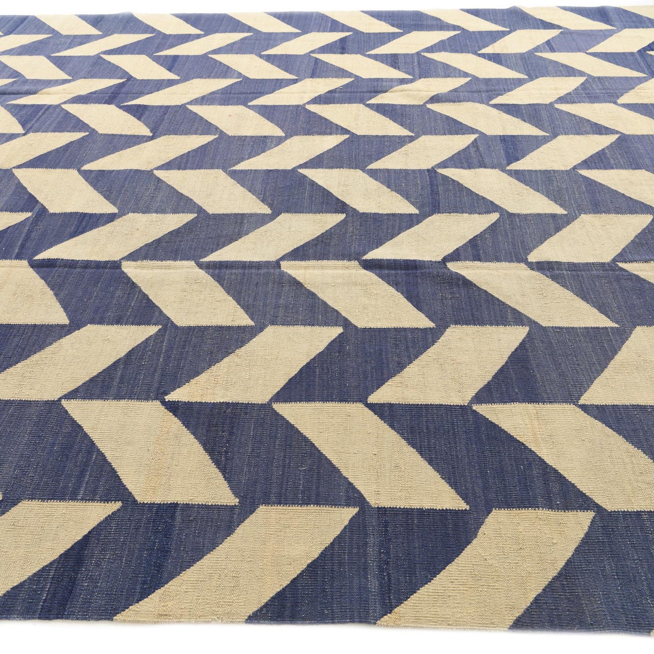 A 10x13 rectangular Kilim Modern rug with a bold chevron pattern in navy blue and cream, suitable for a living room.
