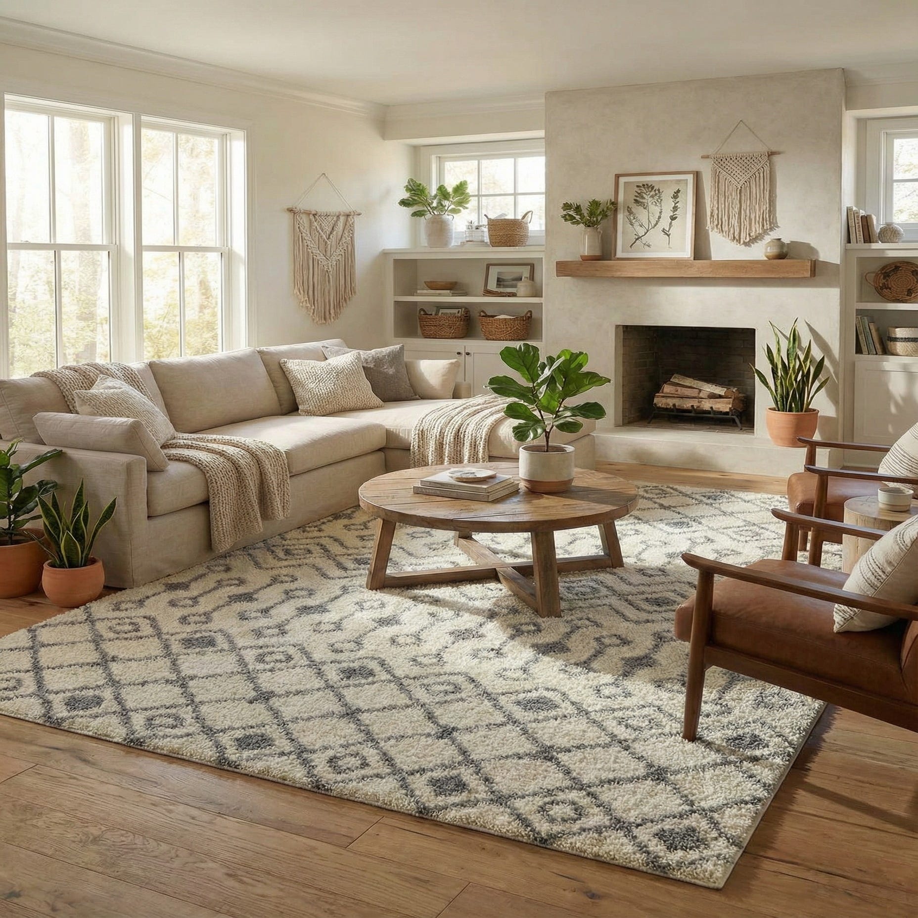 Place this rug in a casual living room to anchor a seating area, layer it under a bed to add warmth to hardwood floors, or use it in a family room or reading nook where a soft surface is desirable. It pairs naturally with warm wood tones, neutral linen upholstery, leather accents, and woven textures—suiting modern farmhouse, Scandinavian, transitional, and boho interiors.