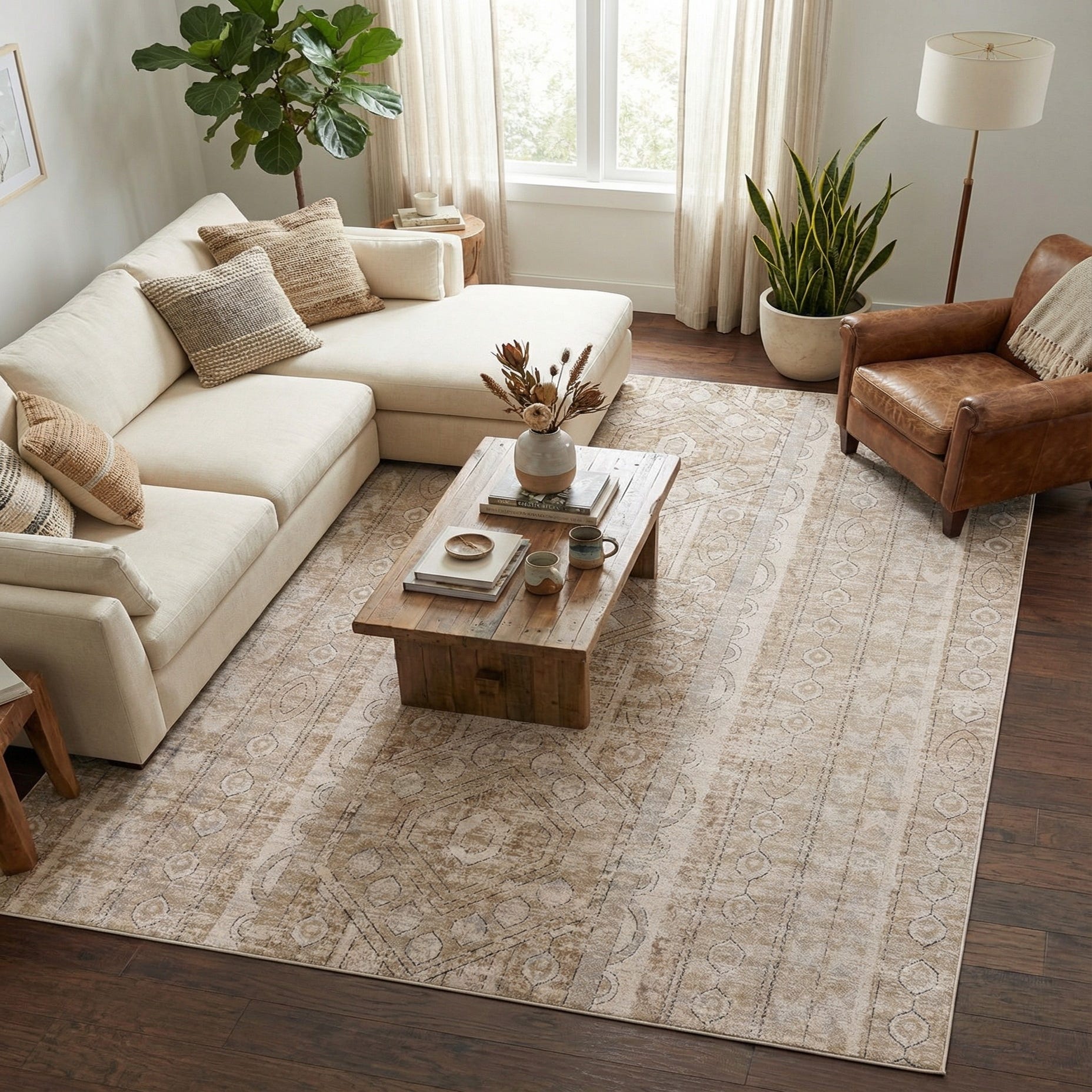Machine made from 85% polypropylene and 15% polyester, the rug has a low, even pile that feels smooth underfoot and lays flat beneath furniture. Its texture is soft yet structured, with the woven pattern offering a faintly raised effect you can see and feel. Works well as an anchor for a neutral living room or under a dining table, and pairs naturally with light wood or painted furniture, linen upholstery, and mixed-metal accents. Also a good fit for modern farmhouse, coastal, or softly bohemian schemes where layered textures and calm, earthy tones are desired.