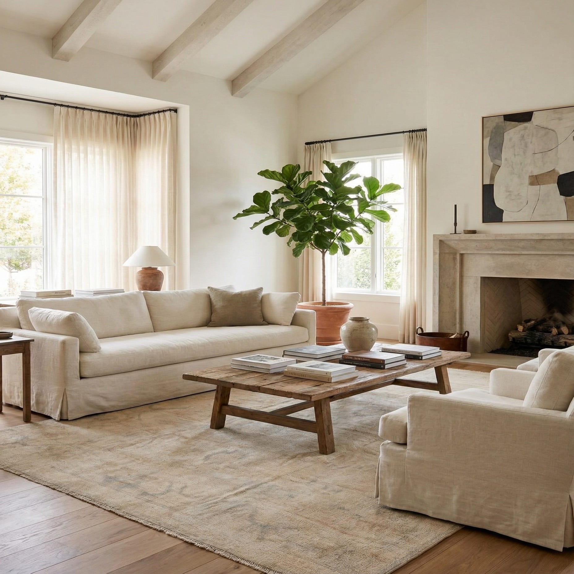 A 10x13 rectangular ivory wool Oushak rug with subtle vintage abstract patterns, ideal for a living room.