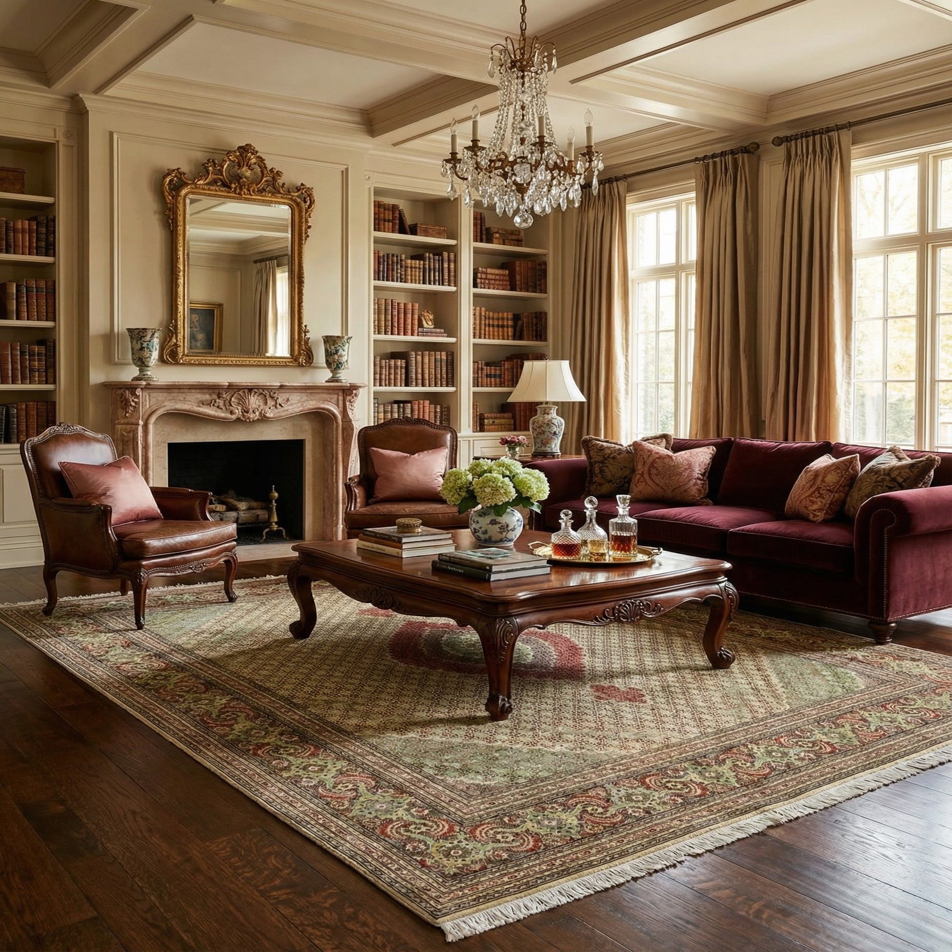 This rug is suitable for a variety of interior design scenarios, from classic to transitional decors. It can serve as a focal point in a formal living room, dining room, or a grand entryway. The ornate patterns and rich colors pair well with both wood and stone flooring, and the rug's size is ideal for anchoring furniture in a spacious area, adding warmth and defined style to the space.