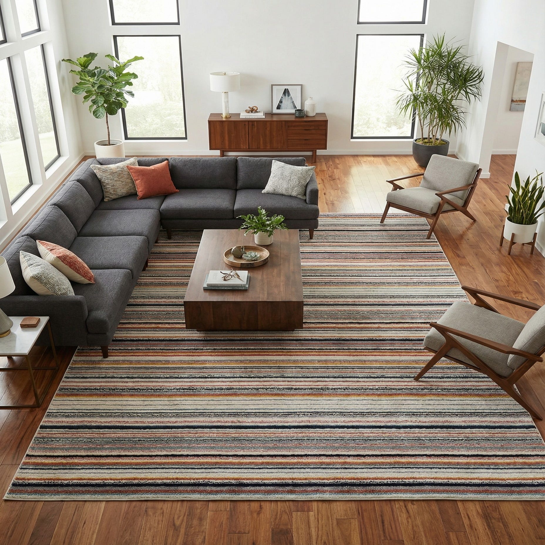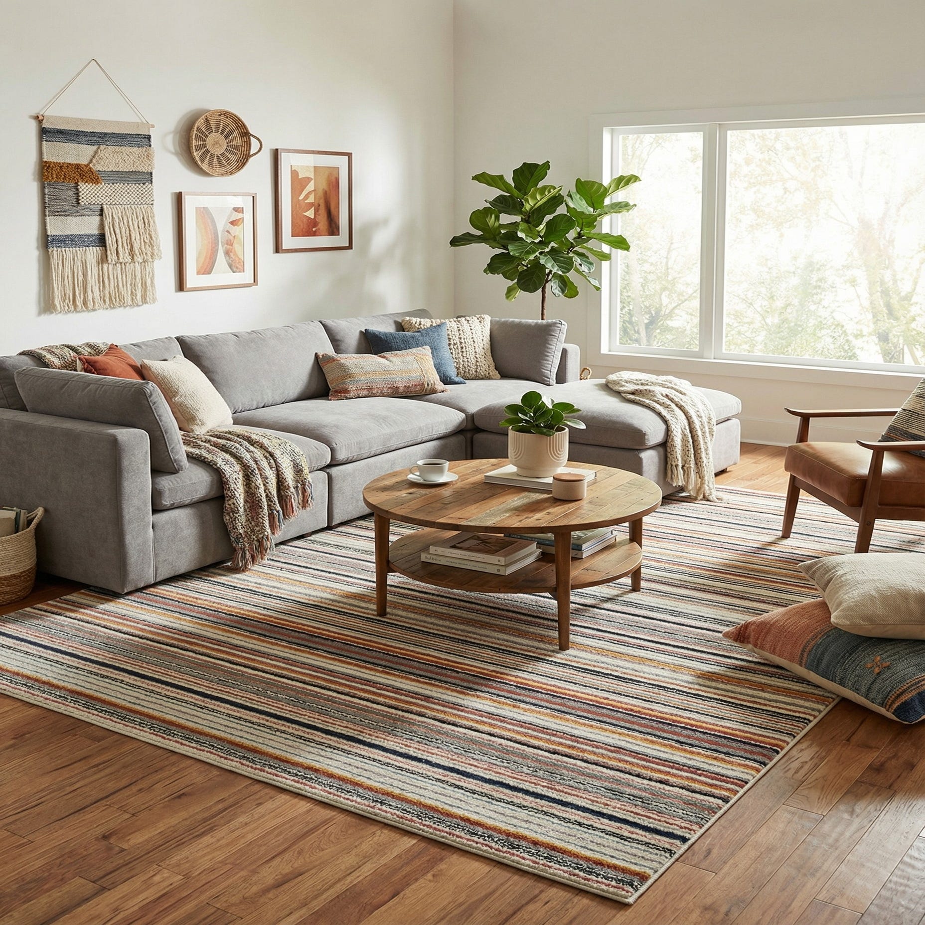This versatile stripe works well in open living areas, dining rooms or a large family room where it can anchor seating and add color without overwhelming the space. Pair it with midcentury or modern furnishings for a fresh, contemporary feel, or use it to bring cohesion to a bohemian or coastal-inspired scheme—navy and light-blue accents will pick up the deeper tones, while peach and yellow pillows add a warm counterpoint. The neutral ivory ground also makes it a good choice over wood or tile floors when you want a bright, inviting foundation.