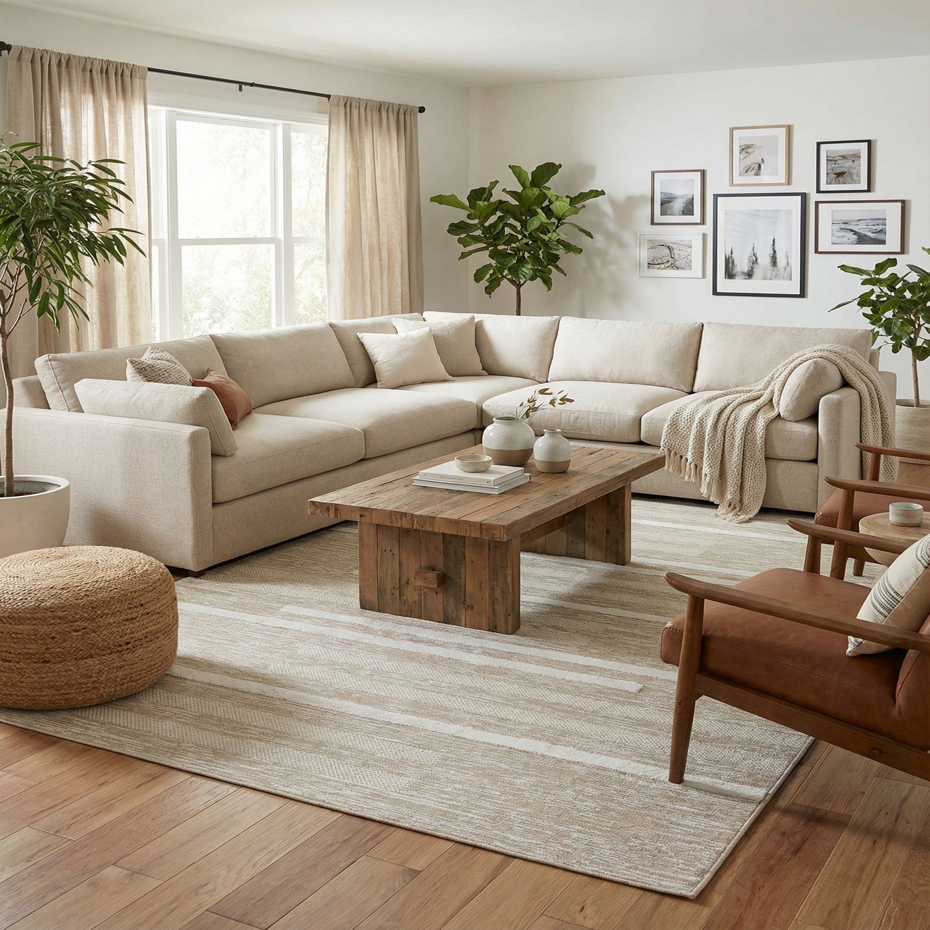 A 10x14 rectangular ivory and cream modern rug with horizontal textured stripes and varying pile heights.
