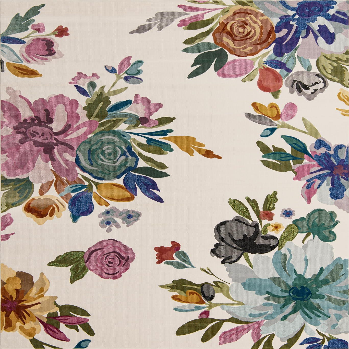 The Blossom Collection offers a 10x14 size rug that brings vibrant energy to any space with its floral pattern. The design features a dynamic array of flowers in a bold palette including ivory, black, various shades of blue, gray, light blue, olive, pink, purple, and yellow, set against an ivory background that allows the colors to pop. Machine-woven of 100% polypropylene, this rug provides durability and a soft texture that welcomes bare feet.