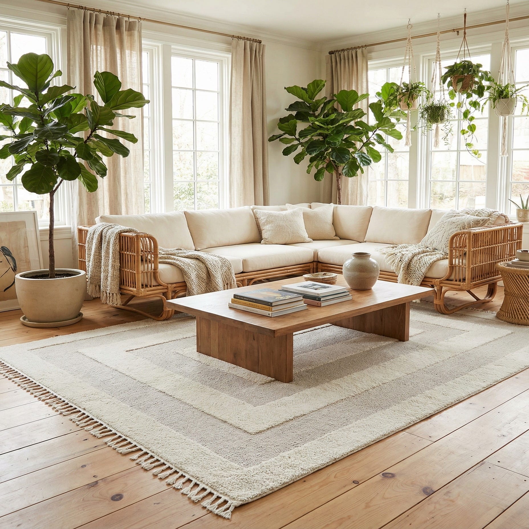 Completing the design, a braided fringe adds a tactile accent at each end of the rug, giving it a relaxed yet refined aesthetic perfect for layering or as a standalone statement. The neutral colors and simple pattern make this rug an ideal candidate for interior styles ranging from contemporary to traditional, as well as minimalist or Scandinavian themes, where its clean lines and unobtrusive palette can blend seamlessly with wooden floors, modern furniture, and understated decor.