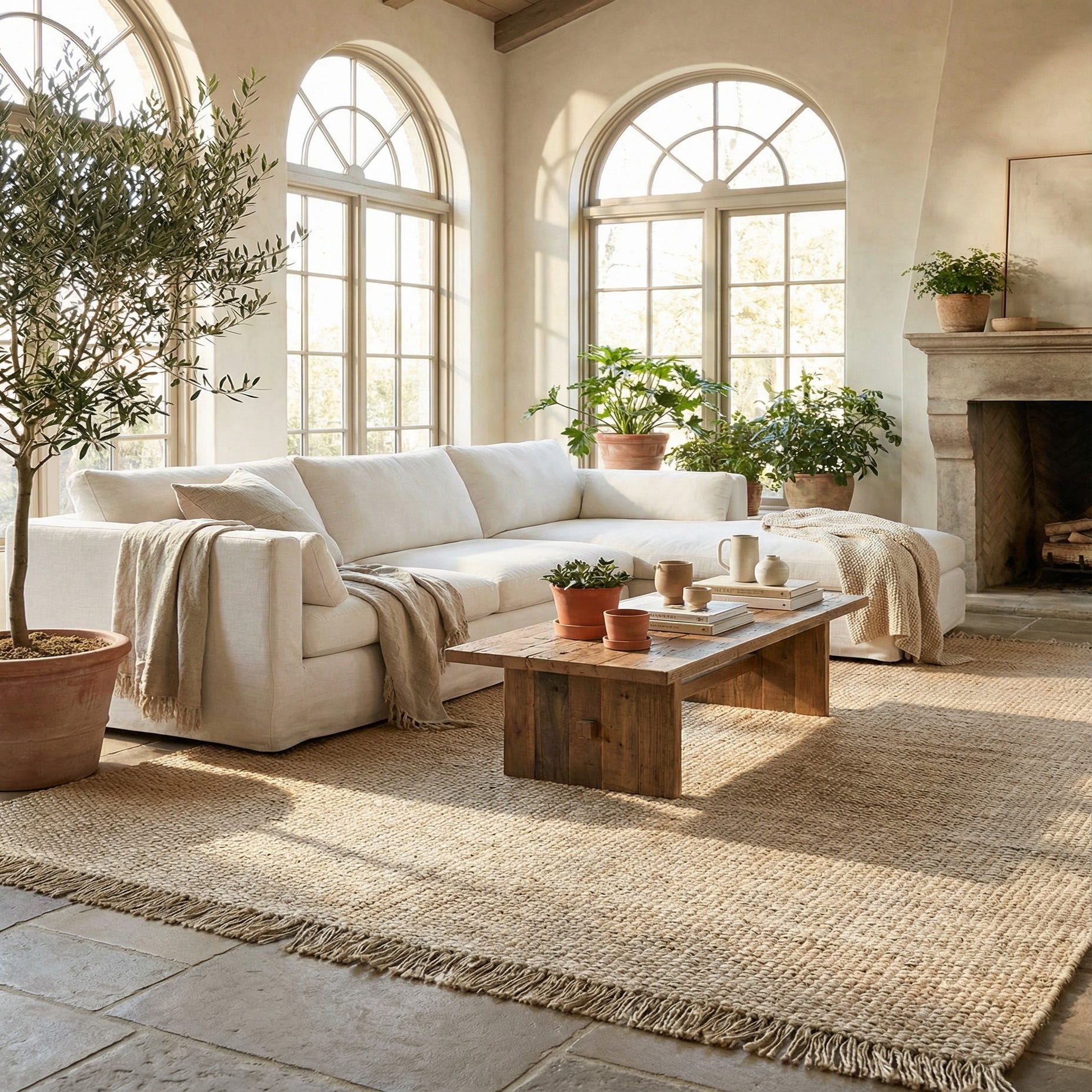 This rug's neutral ivory tone and textured surface render it versatile for an array of interior styles. It would work exceptionally well in spaces that embrace a minimalist aesthetic, providing a warm and inviting feel. The understated elegance of this jute rug also complements Scandinavian, coastal, or modern farmhouse decors, bringing an element of rustic charm to the setting.