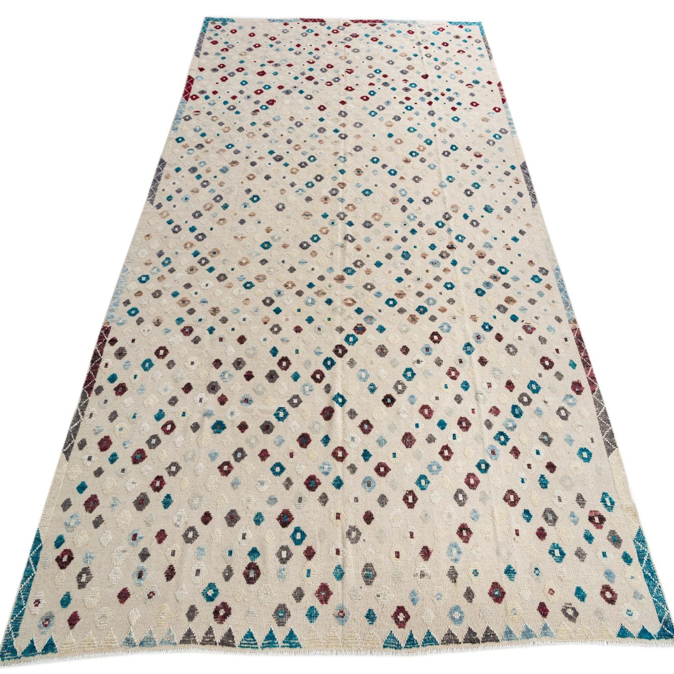 The Darya collection offers a 10x14 hand-knotted rug crafted from 100% wool, boasting a textured finish that lends depth and character to its quality construction. The rug presents a harmonious blend of colors including ivory, brown, light blue, red, teal, and gray, set against a predominantly ivory background. Different hues punctuate the surface in a diamond dot pattern that conveys a sense of rhythm and movement, while the fringed edges add a classic touch.