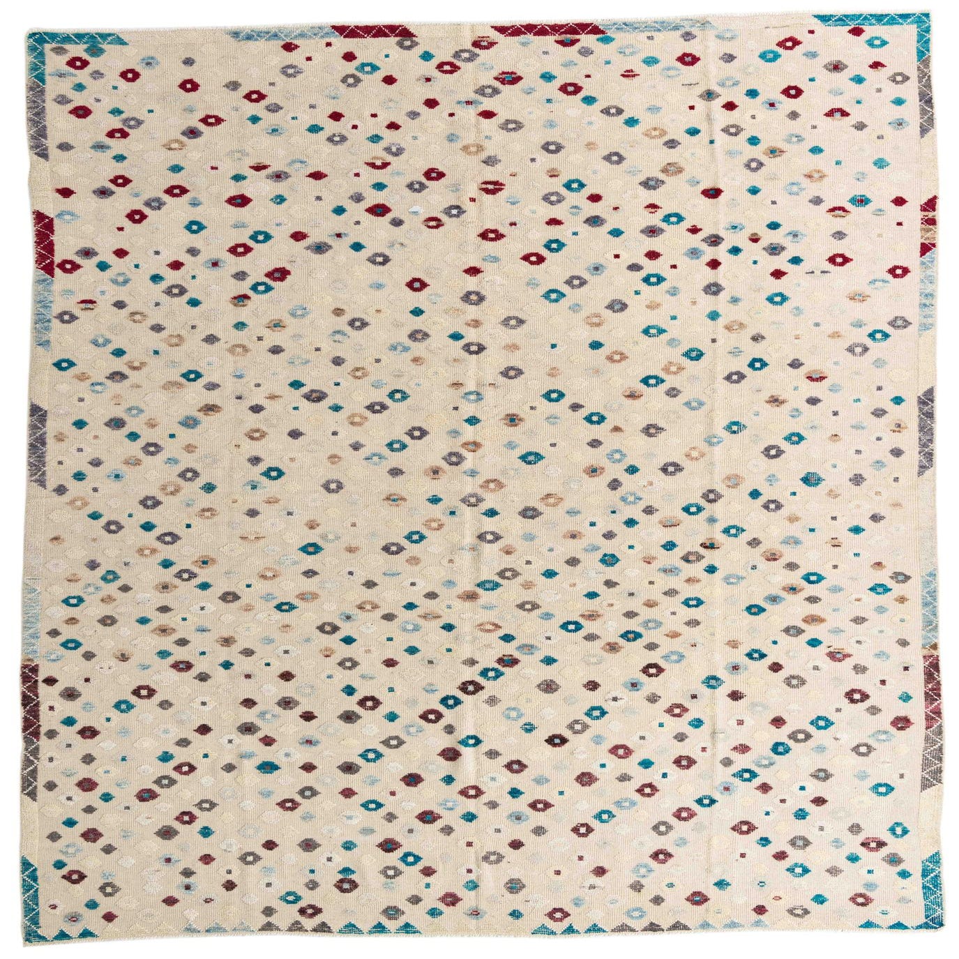 A 10x14 rectangular ivory wool rug with a modern abstract pattern of scattered red, blue, and brown diamond shapes.