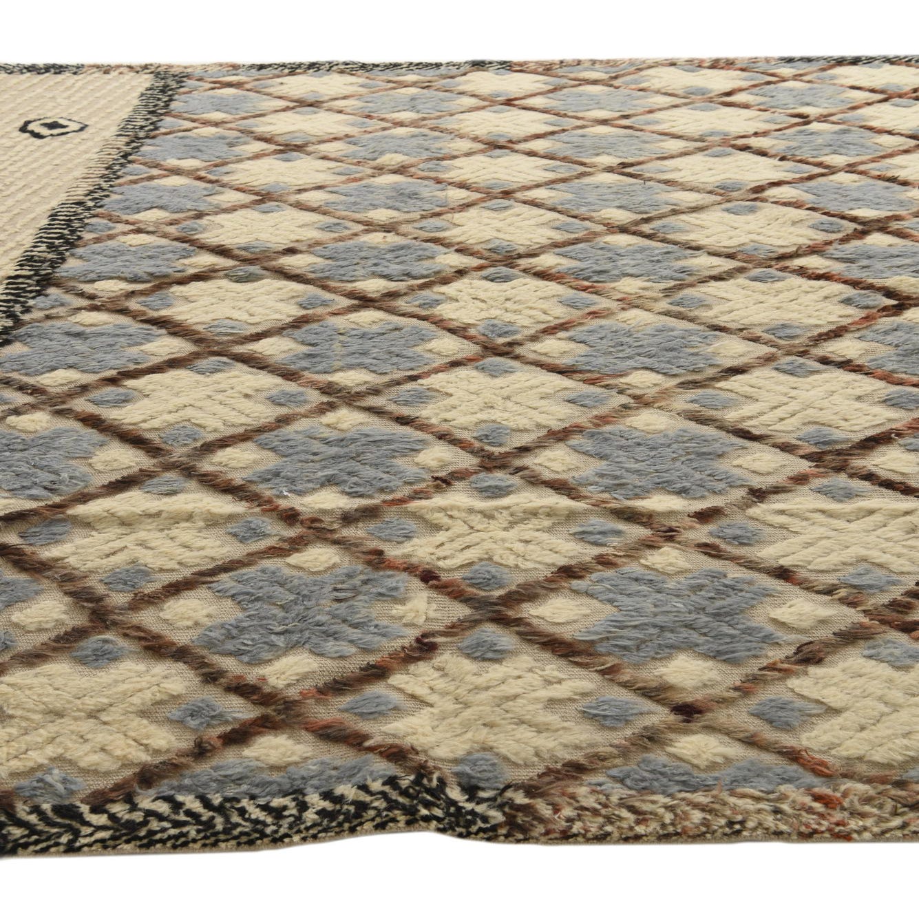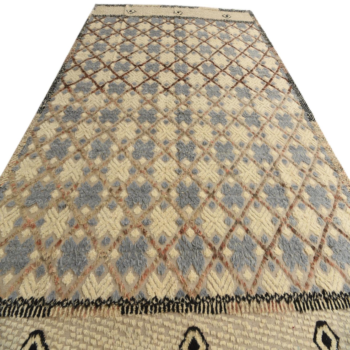 The Darya collection presents a beautifully hand-knotted area rug constructed from 100% wool, offering both durability and tactile pleasure. Measuring a sizable 10x14 feet, this piece features an ivory background that lends a sense of light and openness to any space. The pattern is characterized by a harmonious blend of brown and black geometric lines that create a distinct diamond lattice, accented with subdued blue motifs that add a touch of color without overwhelming the design.