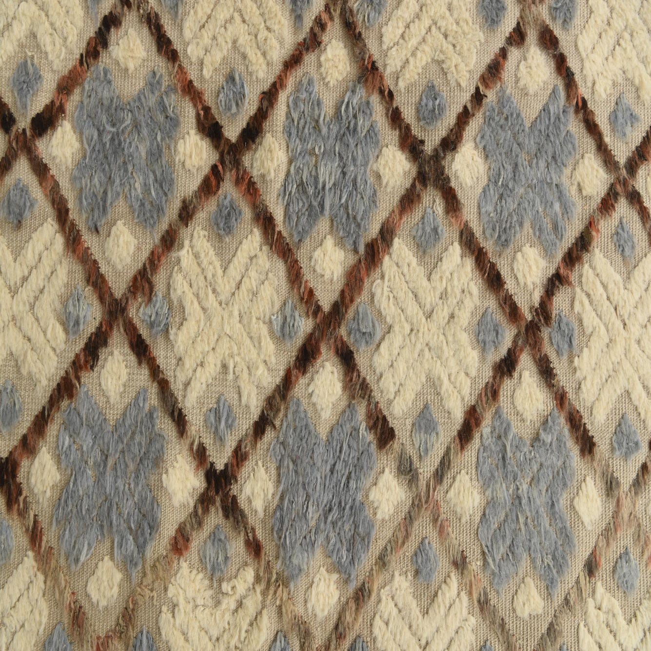 A rectangular 10x14 ivory wool rug with an abstract geometric pattern in cream and light blue, featuring a high pile.