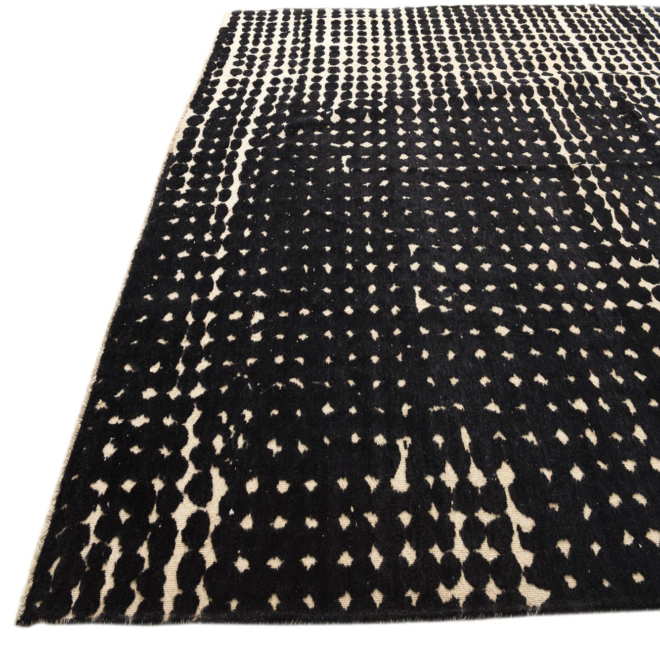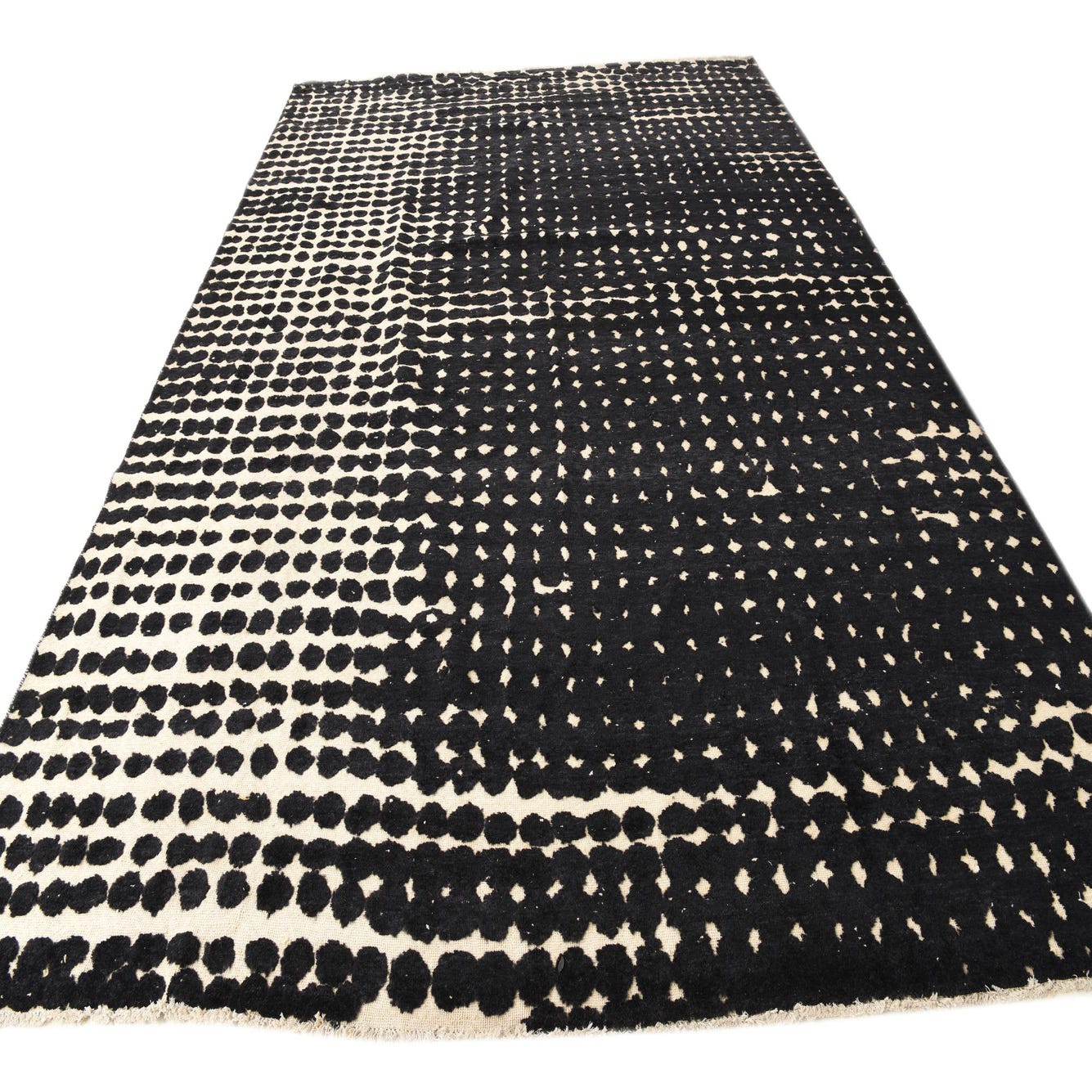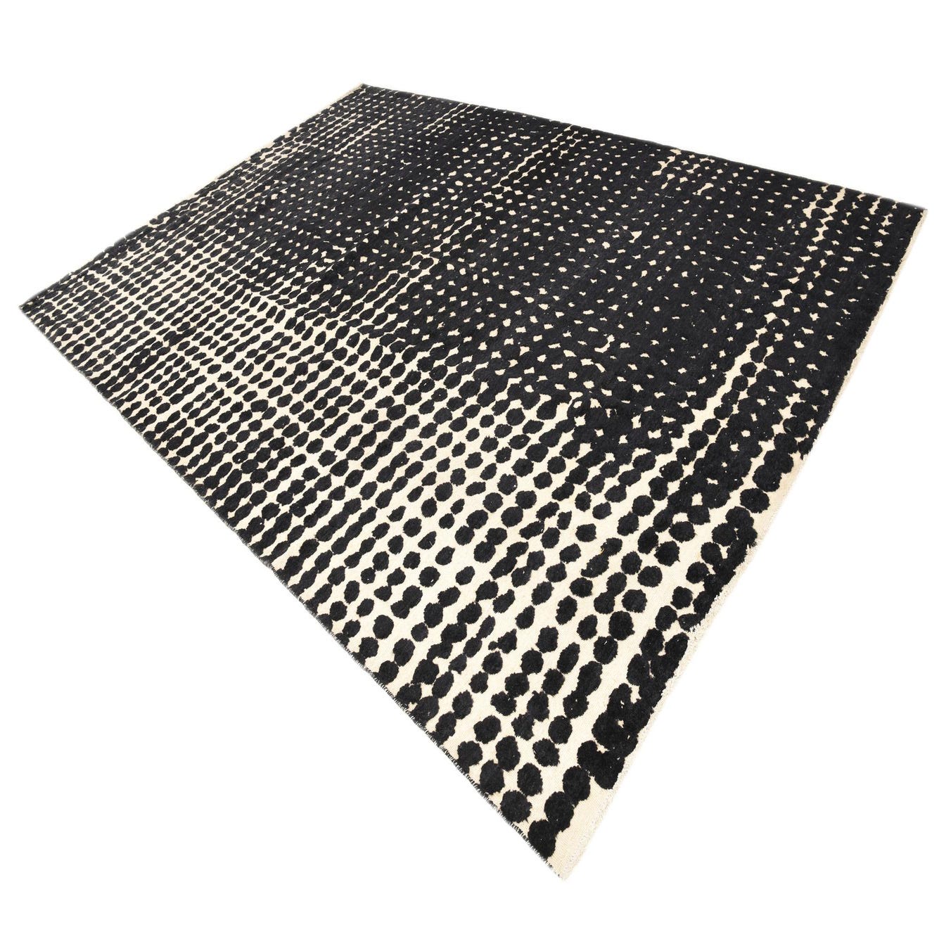 A 10x14 rectangular Darya rug with a modern black and cream dotted pattern, handmade from wool.