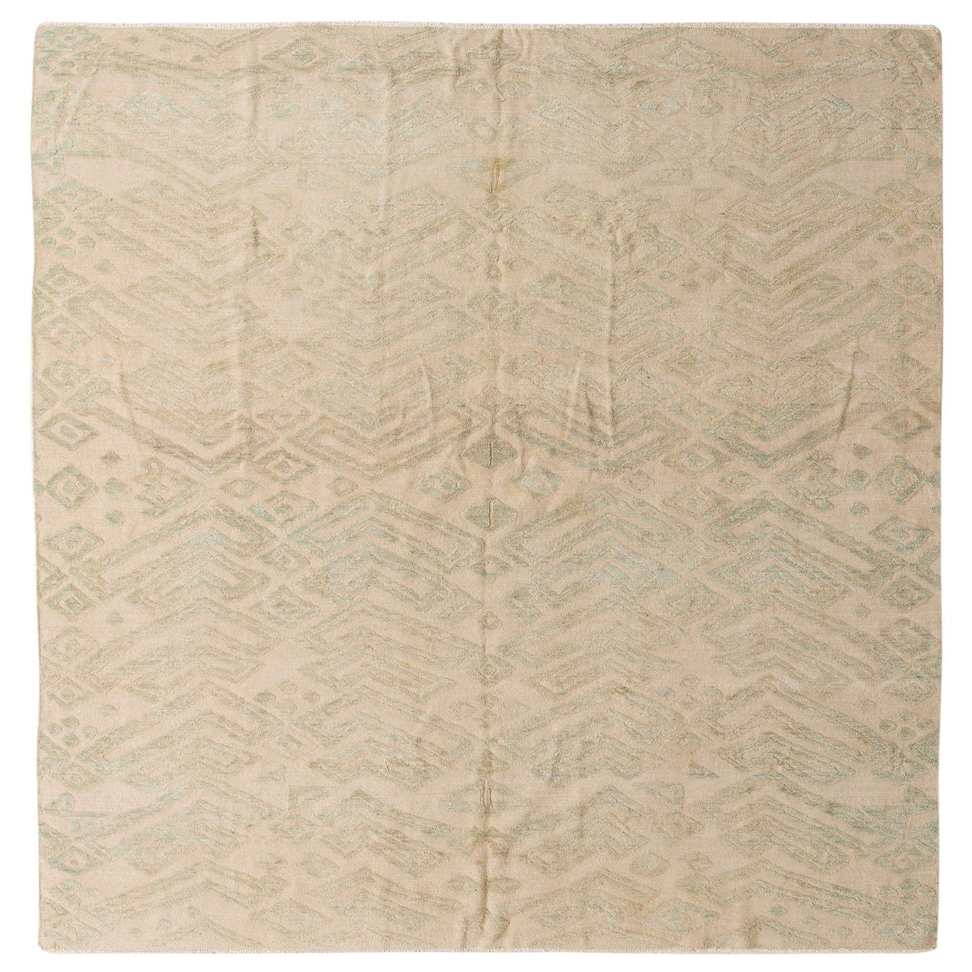 A 10x14 rectangular ivory wool rug with a subtle, textured modern abstract pattern in cream and light blue tones.