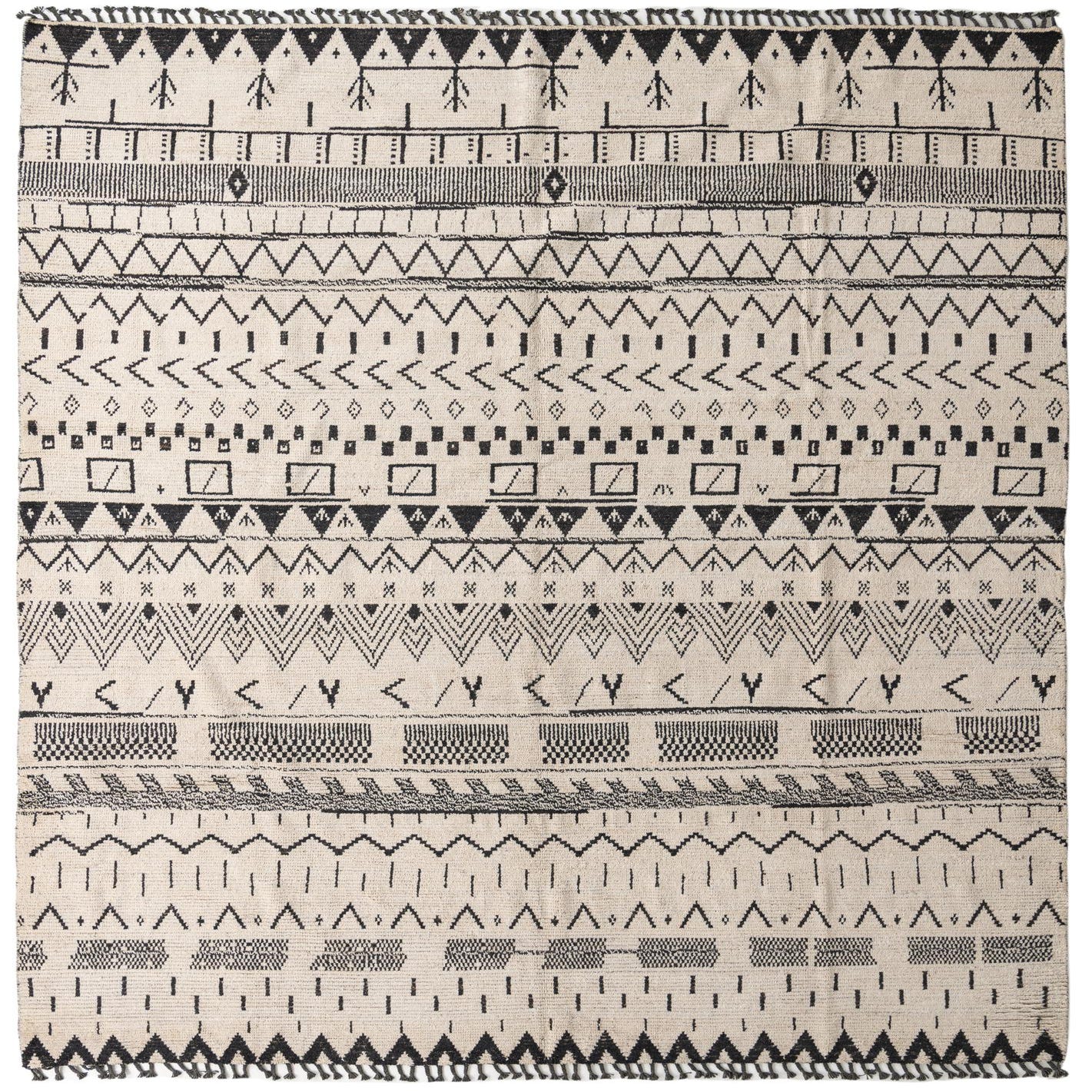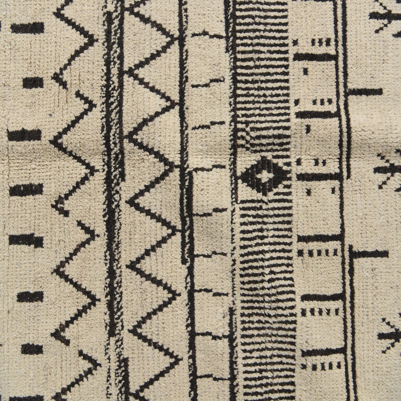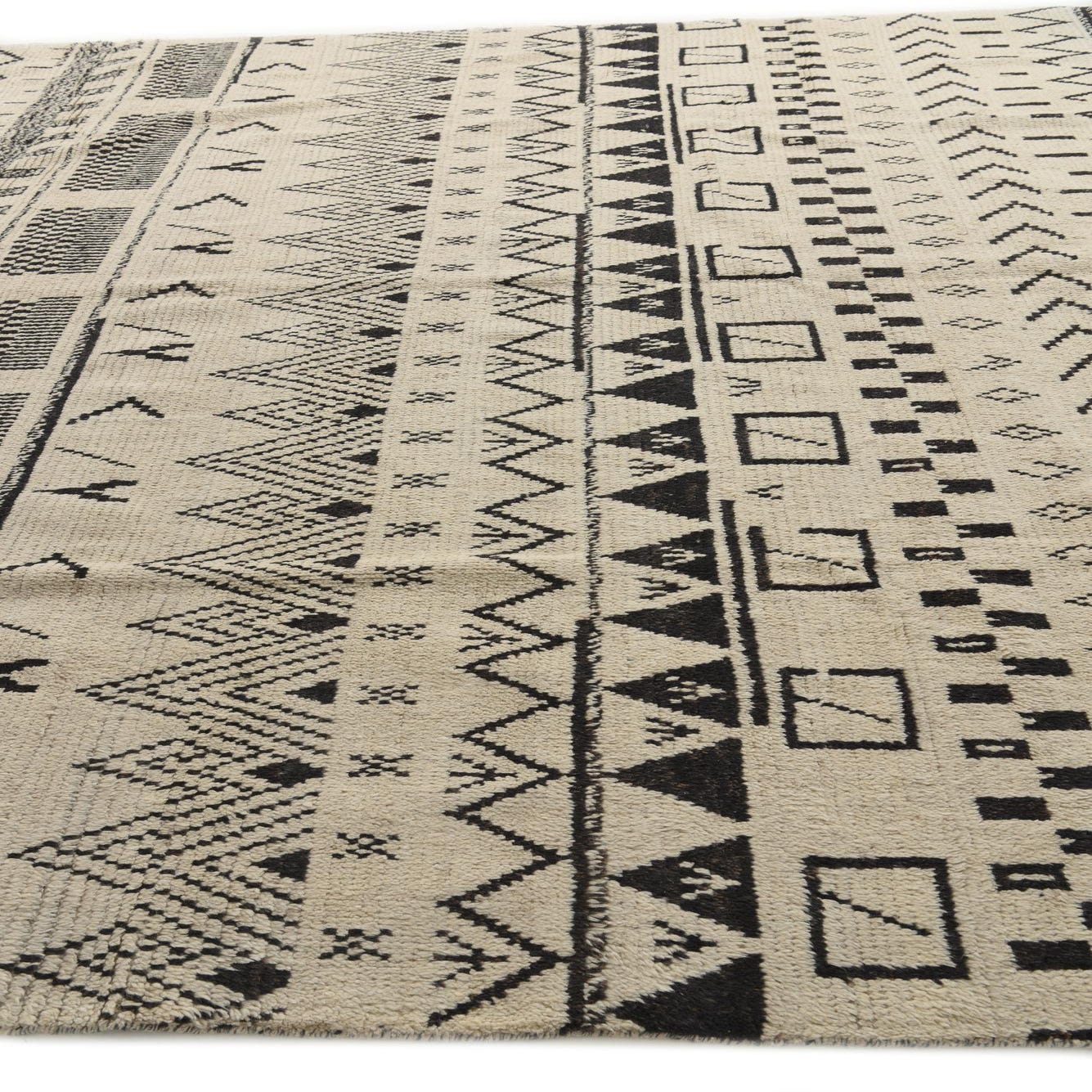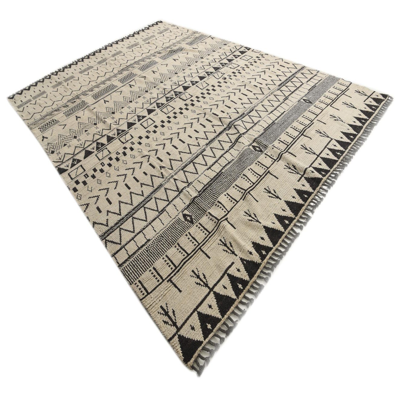A 10x14 rectangular ivory wool shag rug with a modern tribal pattern in black, featuring various geometric shapes and lines.