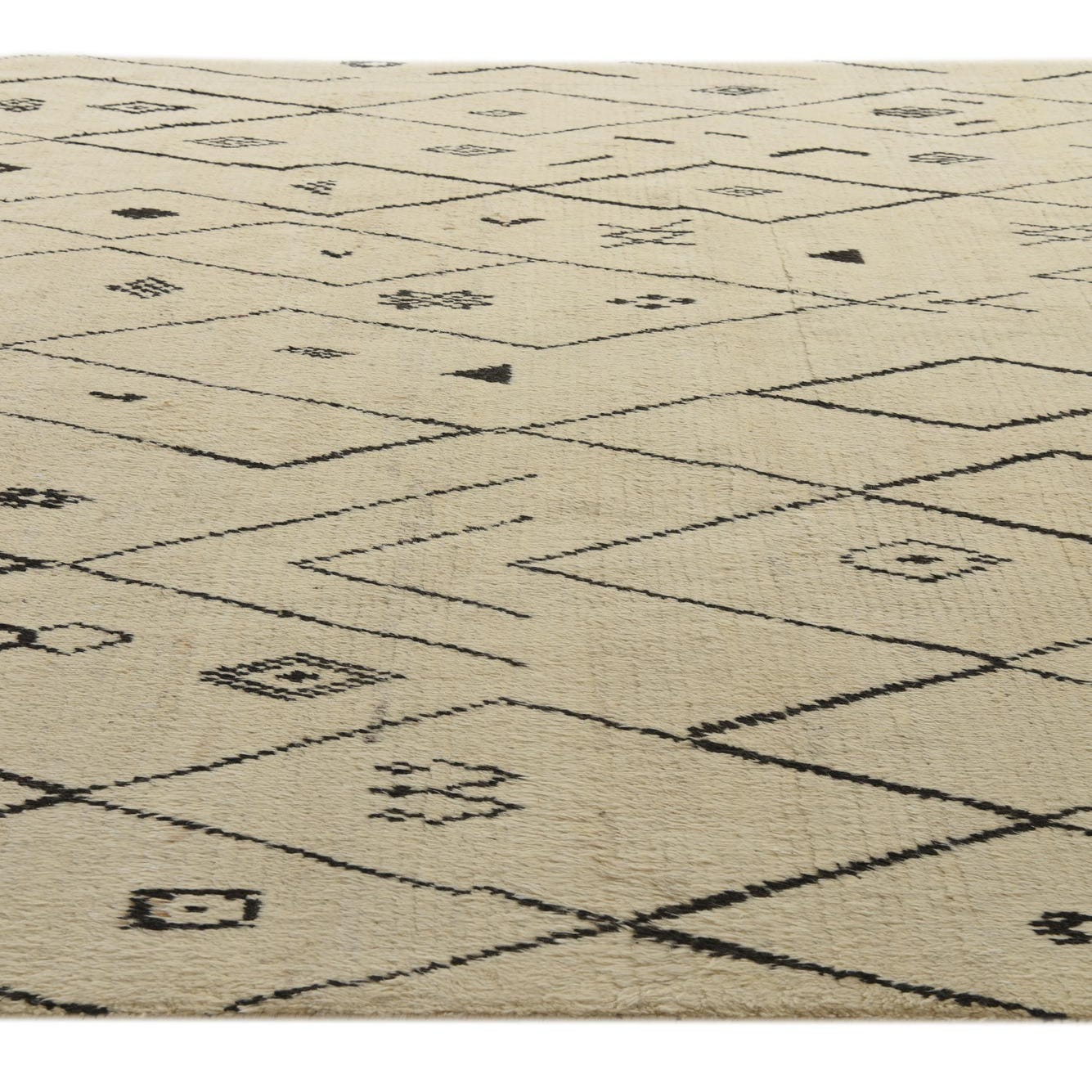 The Moroccan Collection offers a 10x14 hand-knotted rug crafted from 100% wool, boasting a textured surface that adds depth and tactile appeal to its durable construction. This piece showcases a dichromatic palette of ivory and black, with an ivory background providing a neutral canvas for the intricate tribal patterns that adorn the rug. These patterns consist of geometric shapes, linear motifs, and traditional symbols, which together create a visually compelling matrix across the rug's expanse.