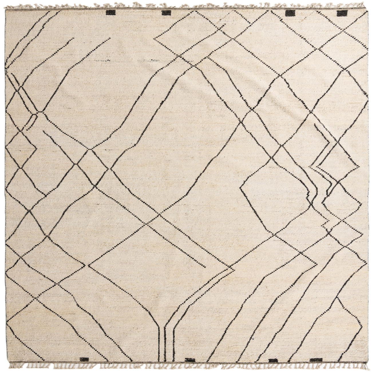 A 10x14 rectangular ivory wool shag rug with a modern tribal abstract pattern of thin black lines and small black squares.