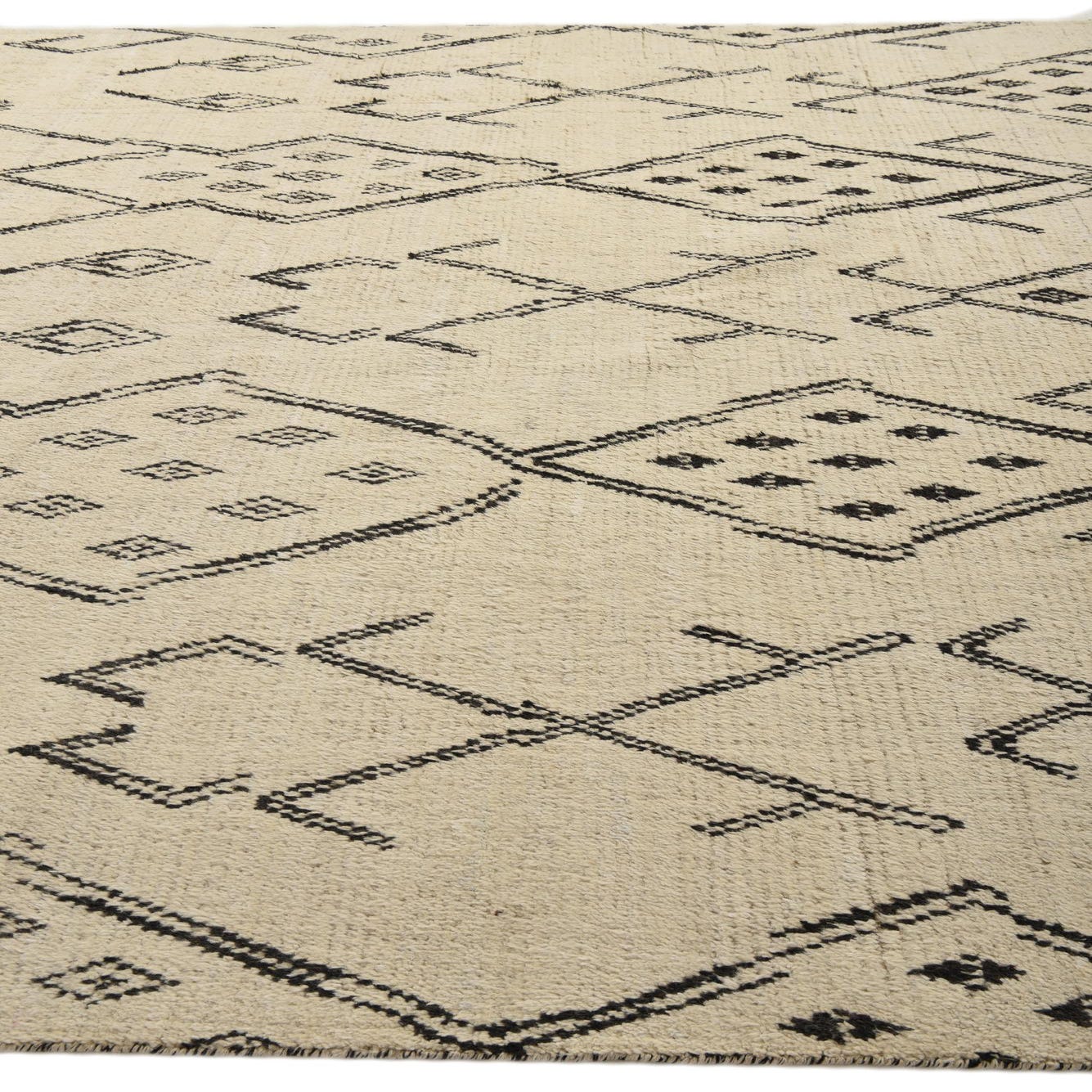 A 10x14 rectangular ivory wool shag rug with a bold black tribal geometric pattern, featuring diamonds and zigzags.