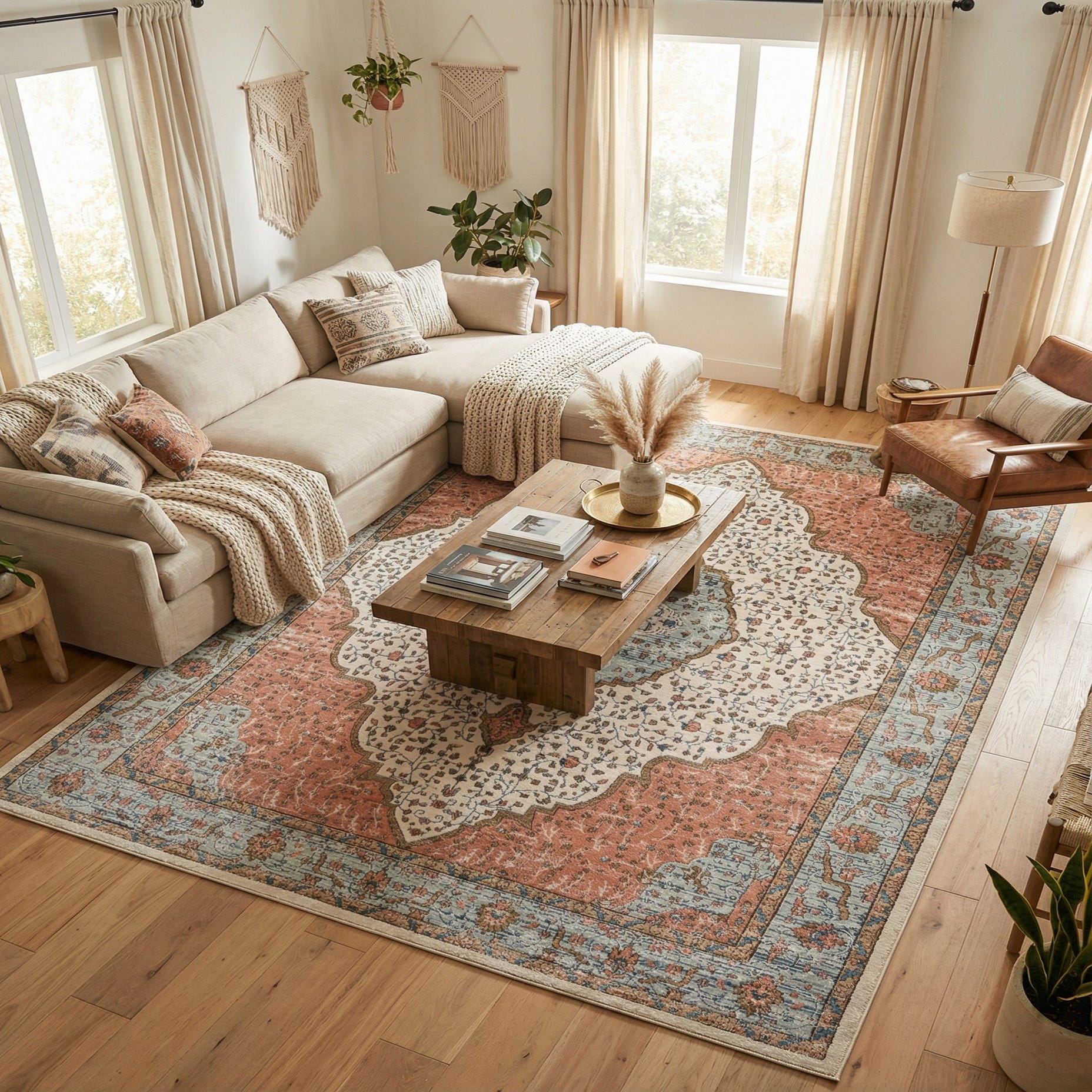 Machine-made from 100% polypropylene, the rug has a low-profile pile with a slightly brushed, smooth hand underfoot that layers easily beneath seating or a dining table. It works well in a transitional living room paired with warm wood furniture and linen upholstery, in a coastal or cottage-style family room where the light blues and ivory brighten the space, or under a dining set to anchor a mixed-material scheme with brass or bronze accents and textured textiles.