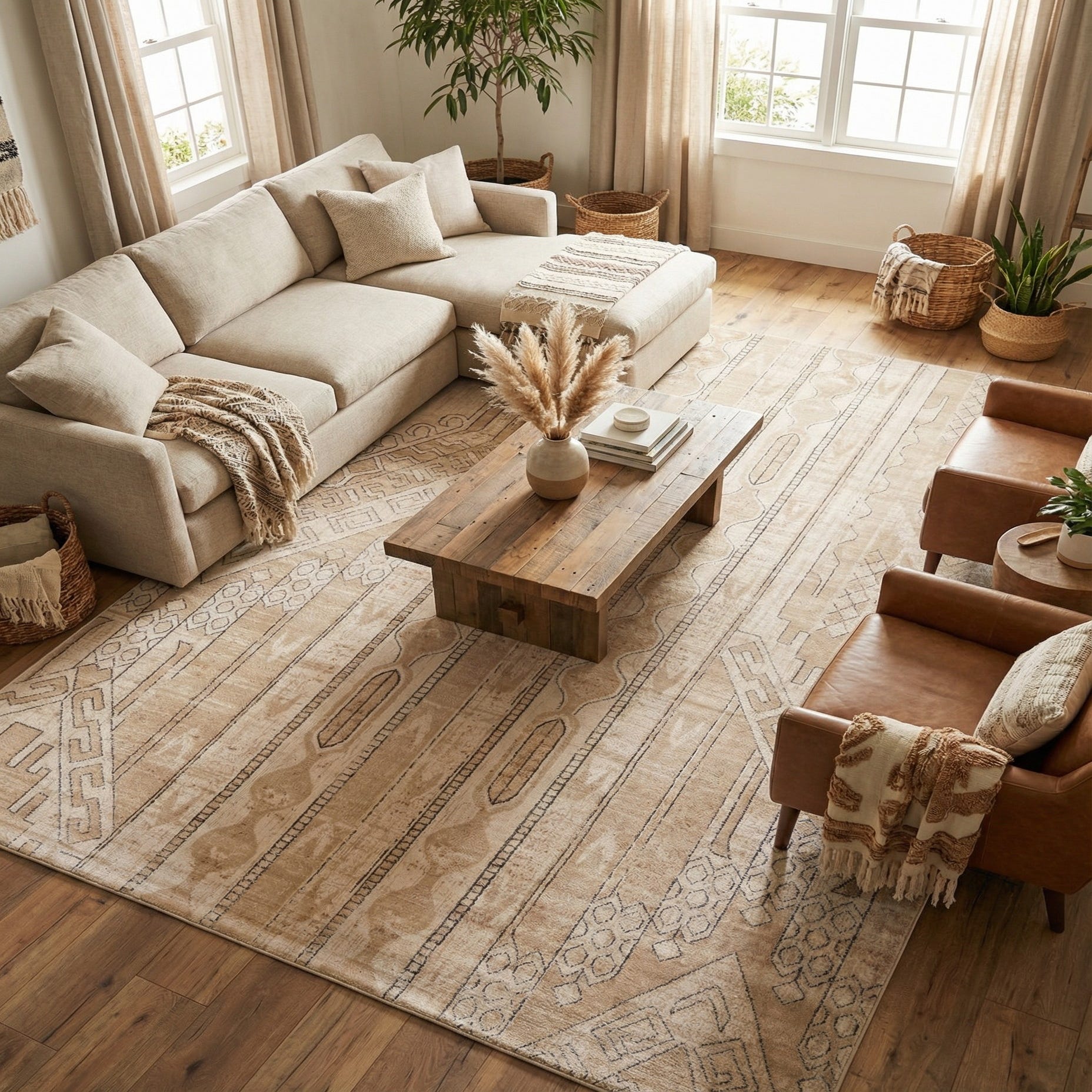 Machine-made from 85% polypropylene and 15% polyester, the pile has a smooth, slightly lustrous hand with a low profile that feels pleasant underfoot. The construction produces clear pattern definition with subtle texture variation where the gray outlines sit against the ivory background. Place this rug under a living room seating area to ground neutral upholstery, layer it in a bedroom to add quiet pattern beneath the bed, or use it in a home office or entry to introduce soft geometric interest that complements modern, transitional, Scandinavian, or farmhouse interiors.