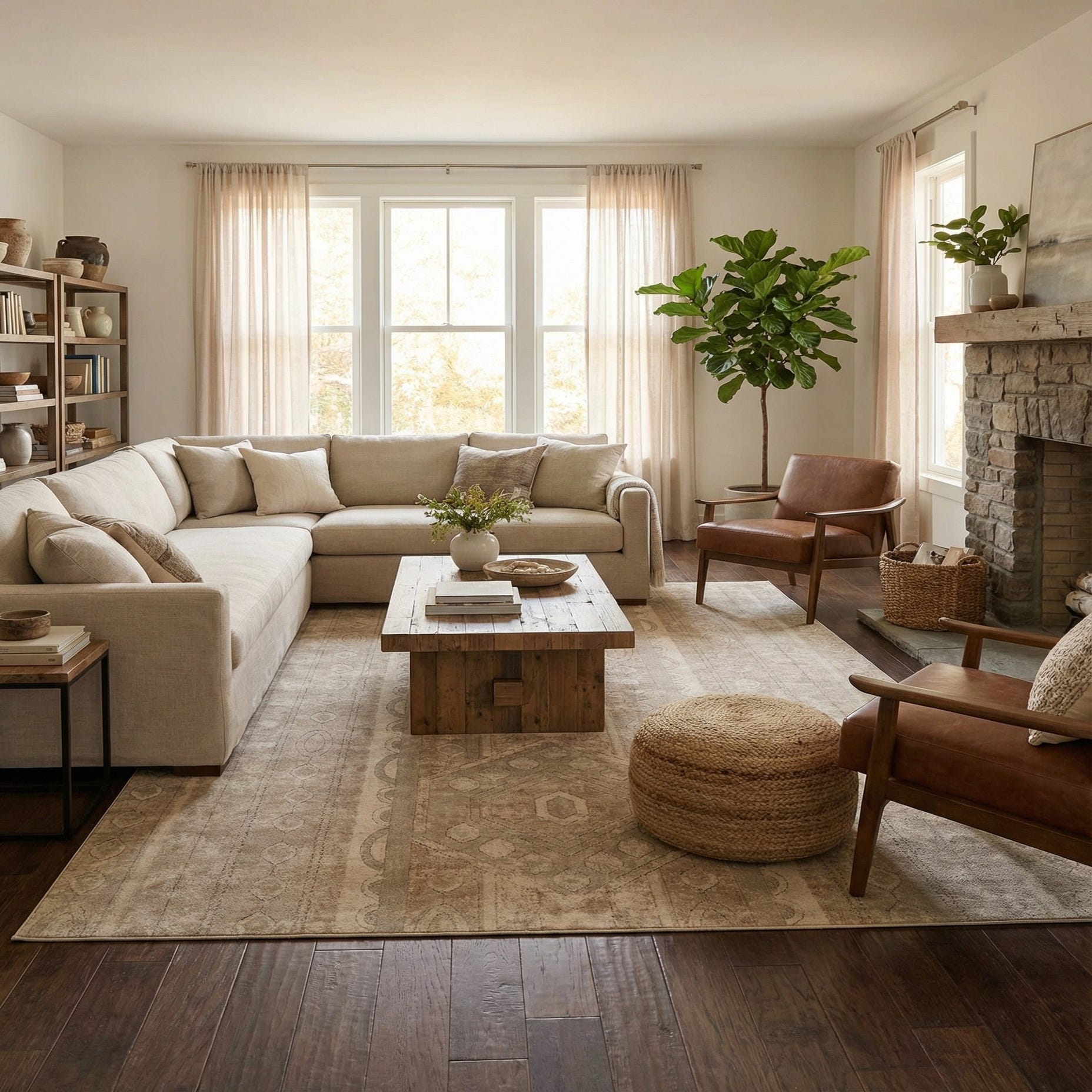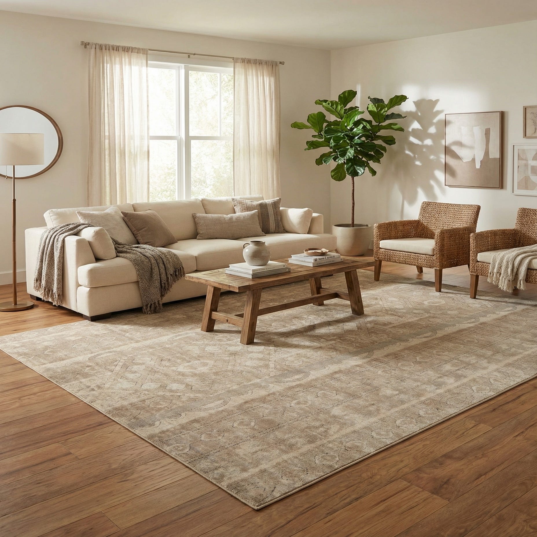 The neutral palette and understated design make this piece a versatile foundation for many rooms. Use it under a living room seating group to anchor sofas and a coffee table, beneath a dining table for a cohesive dining area, or layered in a bedroom to add warmth underfoot. It pairs well with modern farmhouse, transitional, coastal, or contemporary interiors—try it with warm woods and woven textiles for a comfortable, layered look or with cool grays and metal accents for a more streamlined, modern feel.