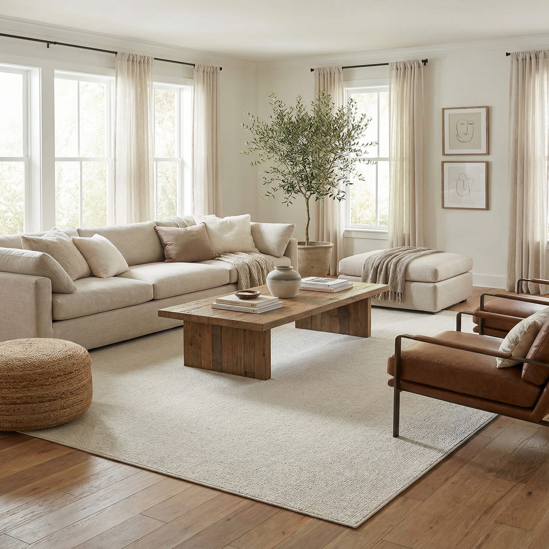 A large 10x14 rectangular ivory flatweave rug with a subtle textured modern solid pattern, suitable for indoor or outdoor use.