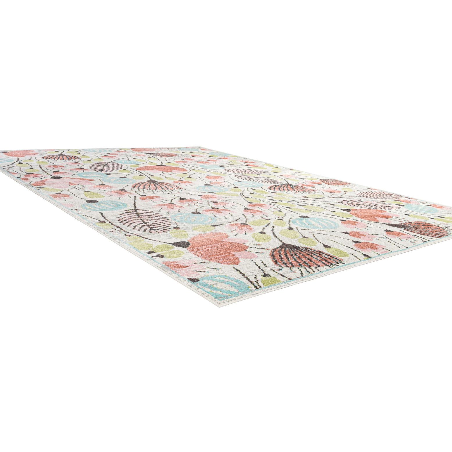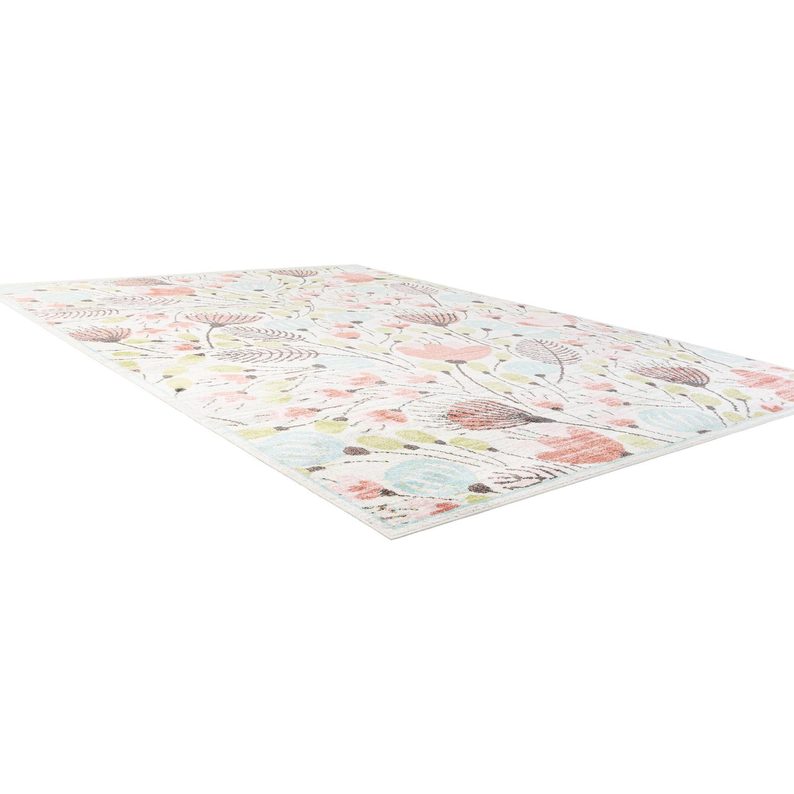This piece brightens a child's bedroom or playroom and also works well in a casual family room, sunroom, or cottage-style living space where a playful, modern-botanical touch is desired. The light ivory background keeps the room feeling open while the colorful accents provide easy coordination with pastel bedding, painted furniture, or neutral upholstery; try it under a low coffee table or layered beneath a reading nook to anchor the space.