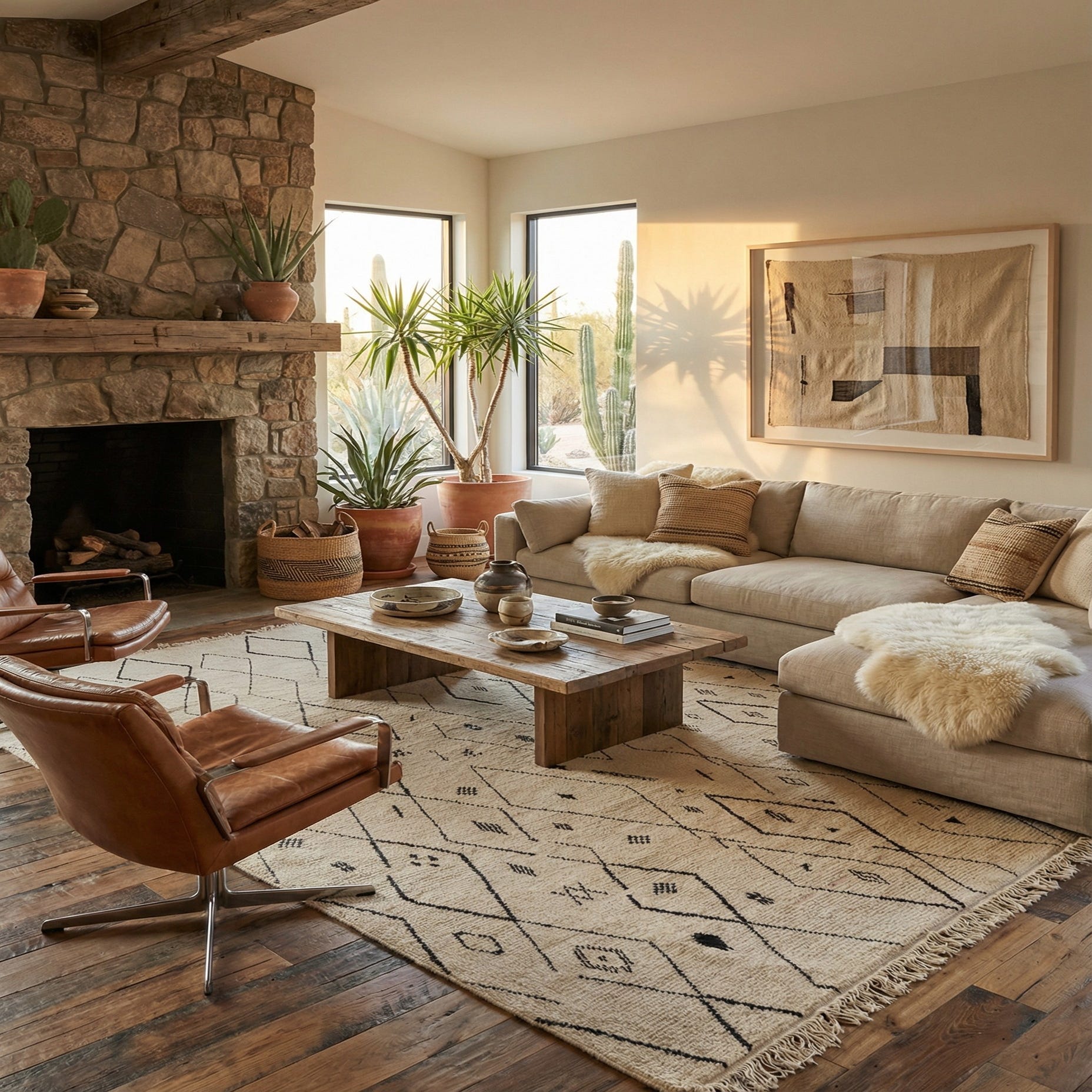 This Moroccan collection rug's large size and impactful design make it suitable for anchoring furniture in living rooms, adding definition to open-plan spaces, or bringing a layer of texture and pattern to understated bedroom designs. Its neutral palette and traditional motifs enable it to serve as a statement piece or as a complementary backdrop to a room's decor.