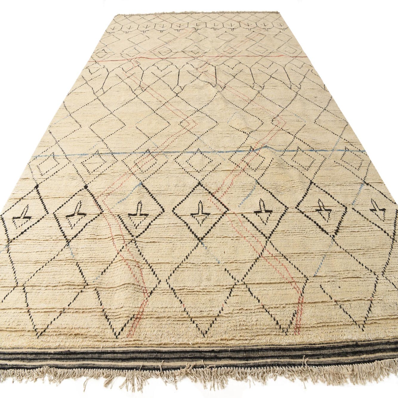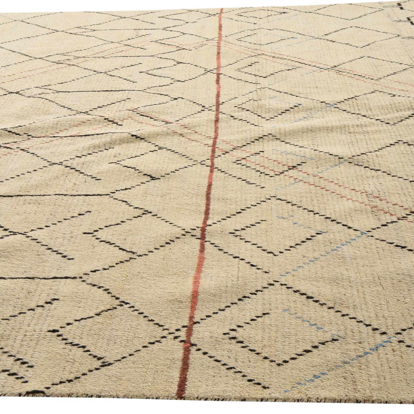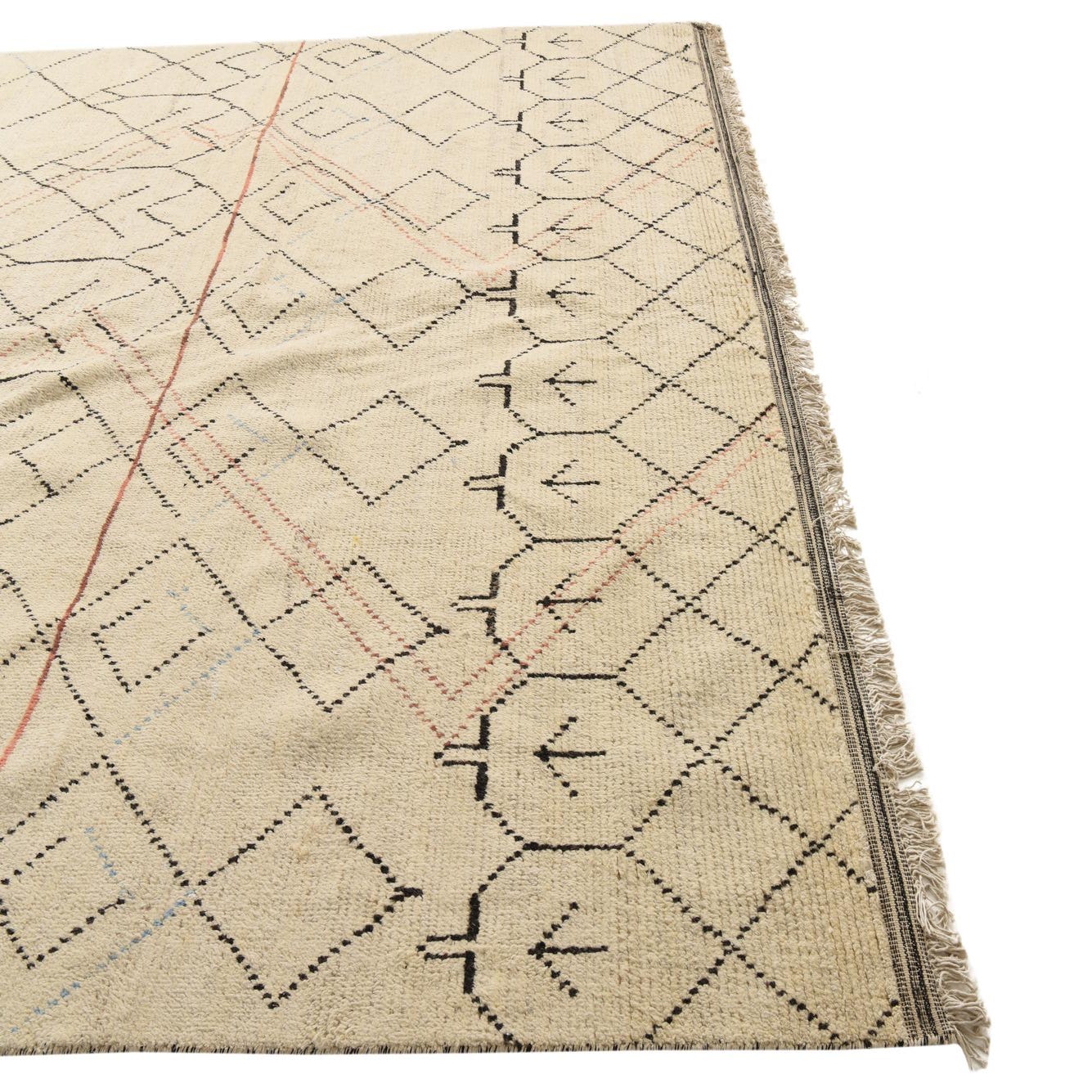 This Moroccan collection rug, hand-knotted of 100% wool, presents a harmonious blend of traditional design and contemporary hues. The rectangular 10x16 rug showcases an ivory background accented with a geometric pattern featuring diamonds and angular lines. The design incorporates a subtle color palette of tan, teal, blue, black, and burgundy, with color accents thoughtfully placed to create visual interest without overwhelming the motif.