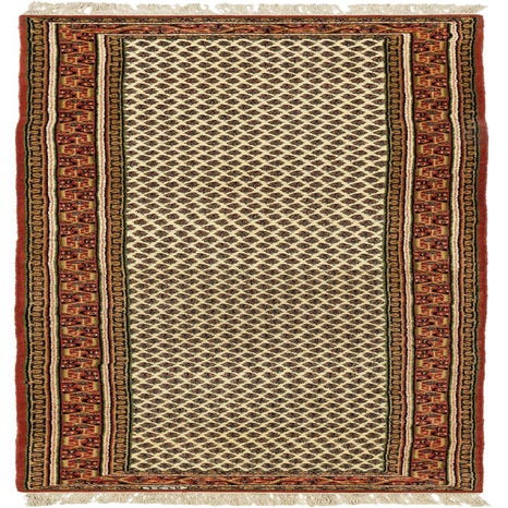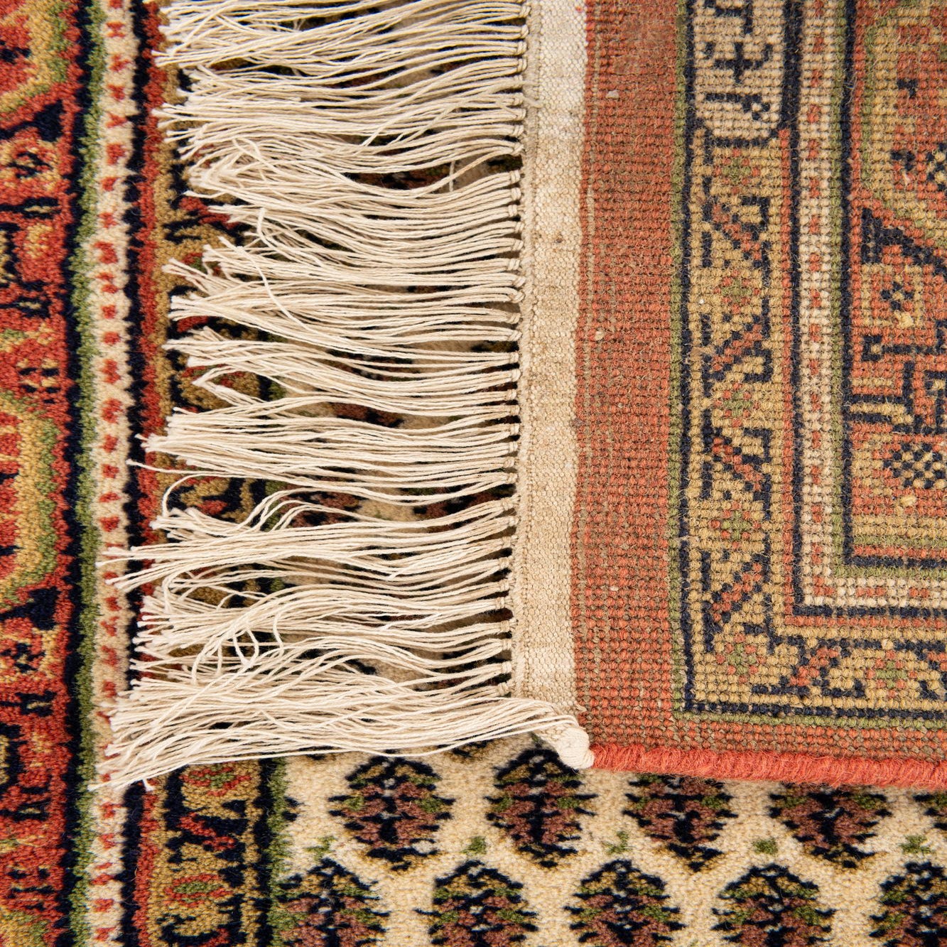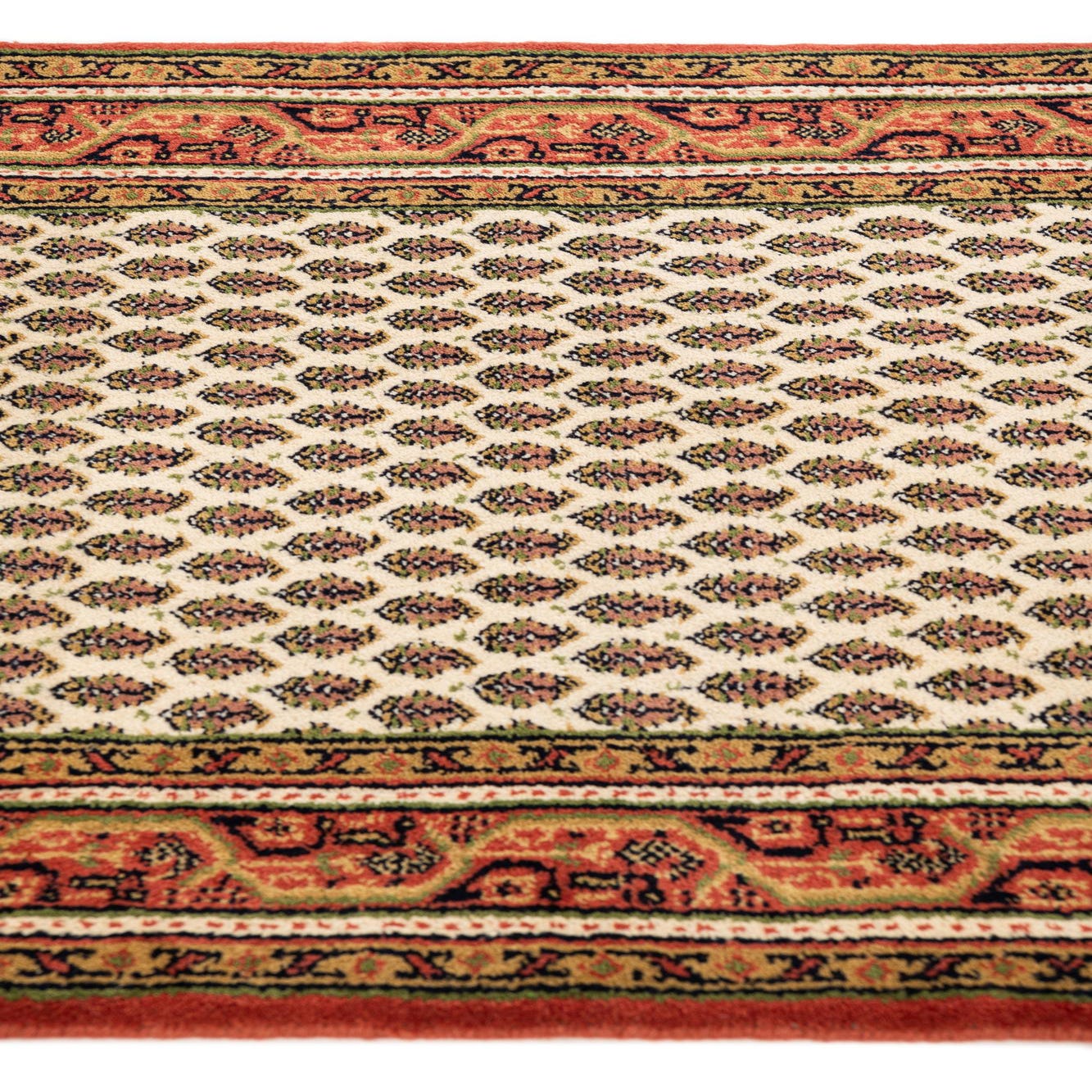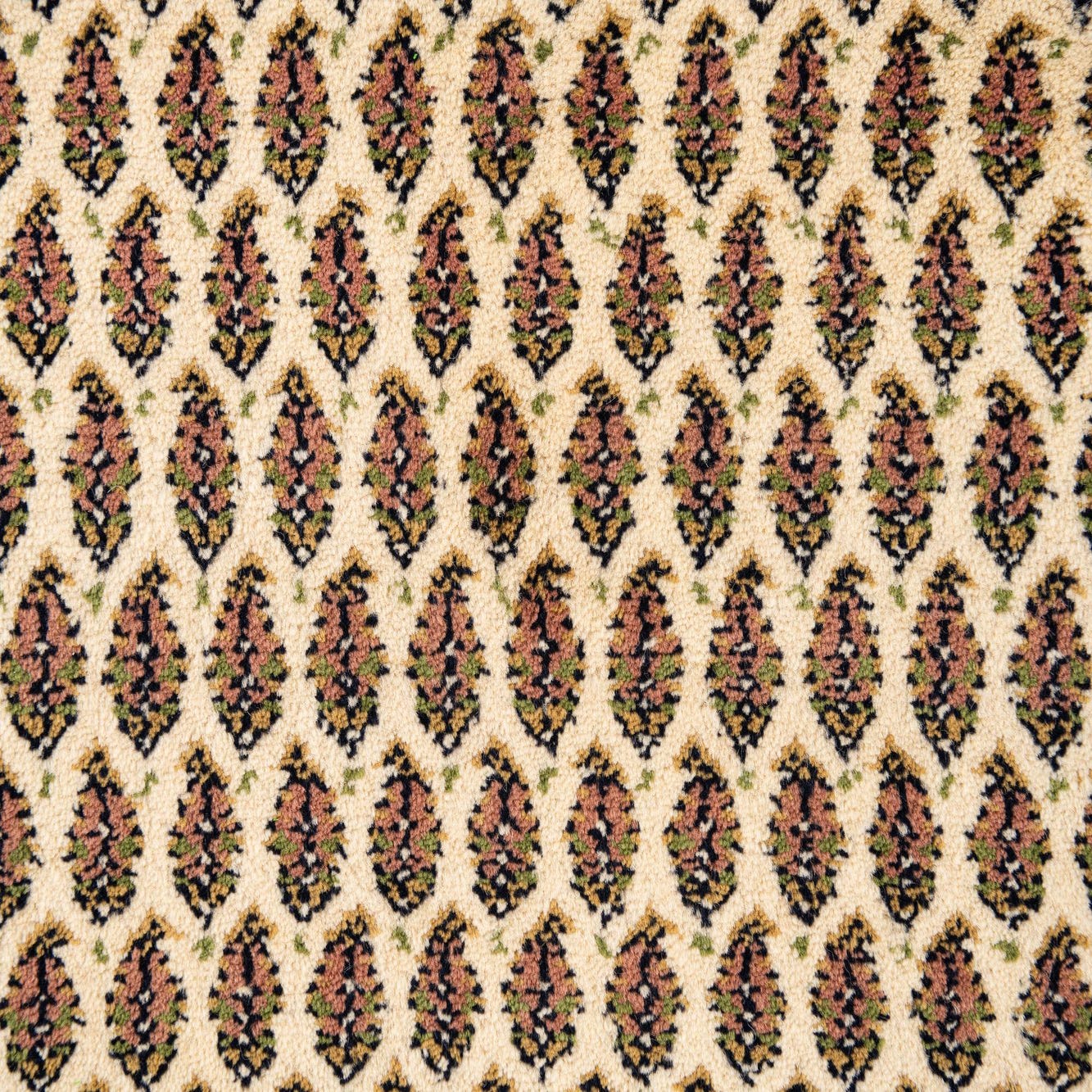 A refined Persian-inspired runner with a repeating boteh (leaf) motif set against an ivory background. Small brown motifs form a rhythmic field while olive and blue accents and soft pink highlights add subtle color variation. A narrow inner guard and a broader rust-toned outer border with geometric medallions frame the design, creating a balanced, traditional pattern. Part of the Mir collection, hand-knotted from 100% wool, the weave has a dense, slightly springy feel and a low-to-medium pile that is pleasant underfoot and offers a tactile, woolly surface.