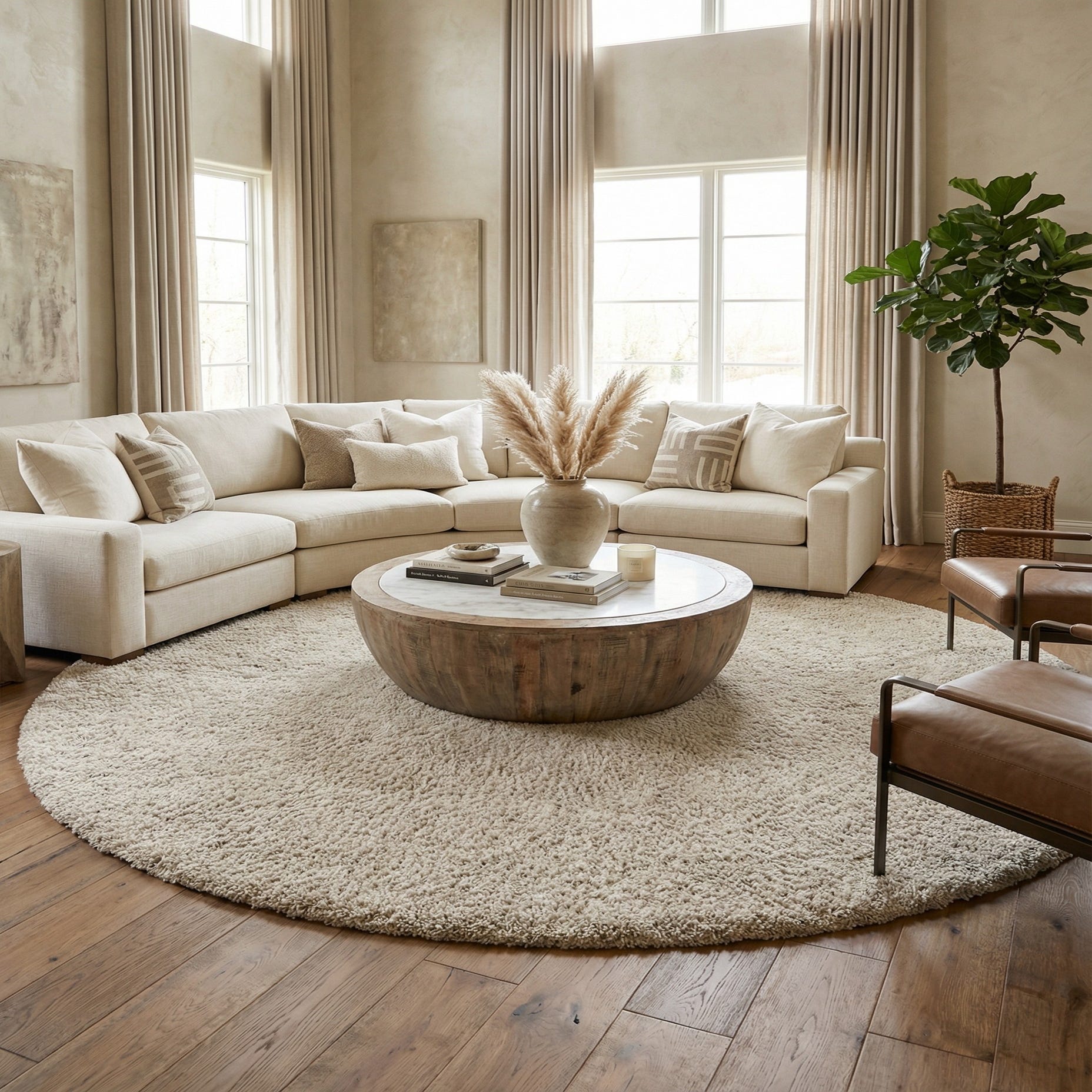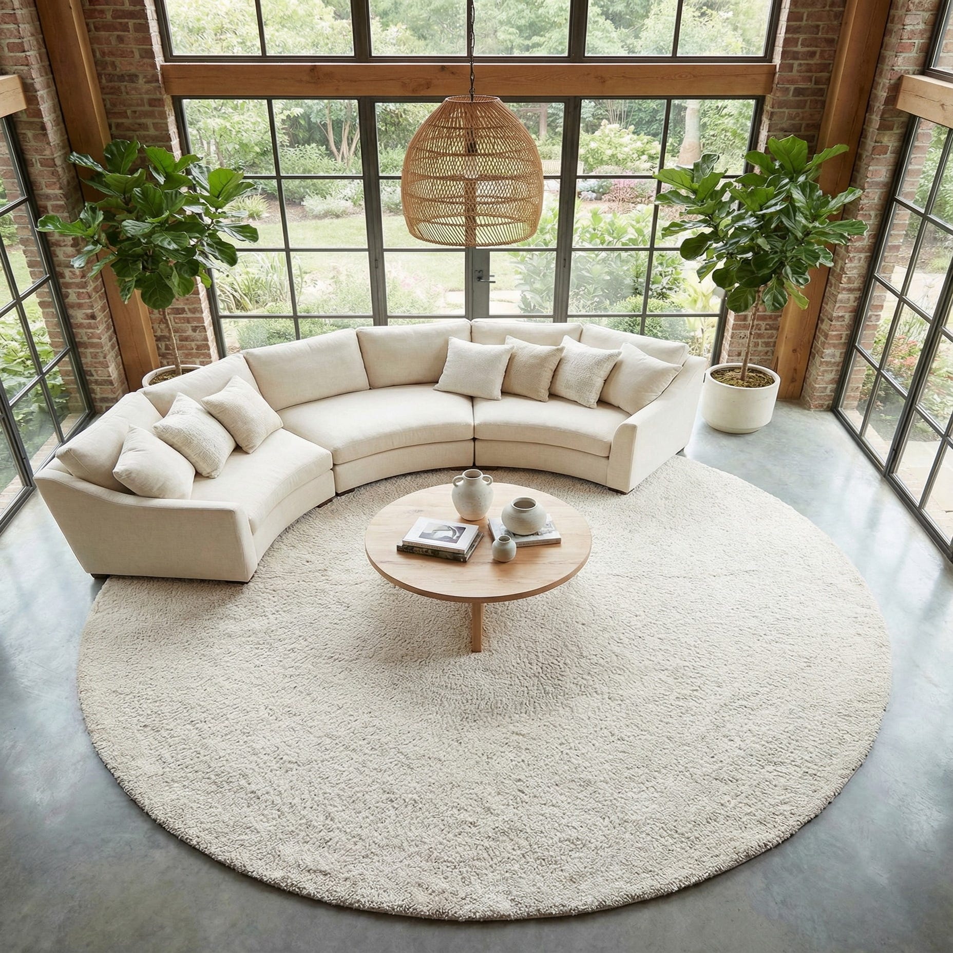 This neutral piece works well as a grounding layer in a living room beneath a round coffee table, under a casual dining setup, or as a cozy seating area in a bedroom or nursery. Pair it with warm wood tones and natural textures for a relaxed, contemporary feel, or place it under streamlined furniture to soften a modern interior.