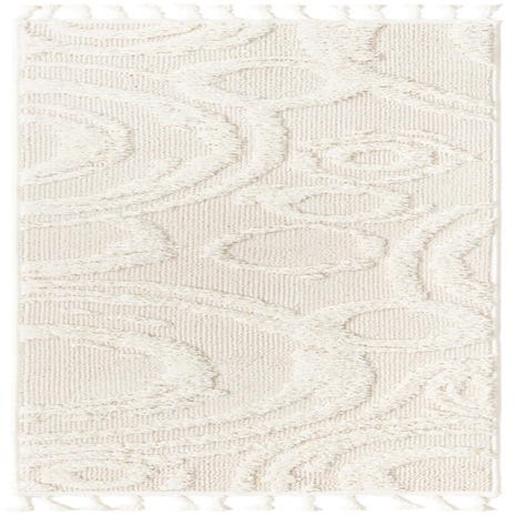 A tone-on-tone ivory runner with an abstract concentric circle motif brings quiet texture and subtle movement to a corridor or entry. The pattern is created by raised, tufted loops set against a low-profile flat base, producing a soft, nubby surface that contrasts with the smoother surrounding weave. Finished with short tasseled ends, the overall look is relaxed and modern with a handcrafted feel. Machine made from 100% polyester, the rug offers a soft hand and consistent pile definition across the surface.