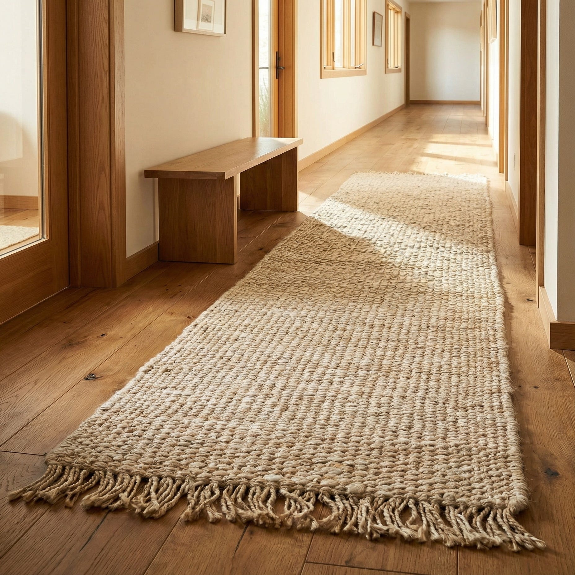 Hand-woven of 100% jute, this runner features a chunky, open weave set on an ivory background. The pattern is subtle and organic, made up of tightly packed, nubby knots that create a low-profile, textured surface with a short tasseled fringe at each end. The natural jute fibers give a firm, tactile feel underfoot—textured to the touch without being bulky, with visible handwoven character throughout.
