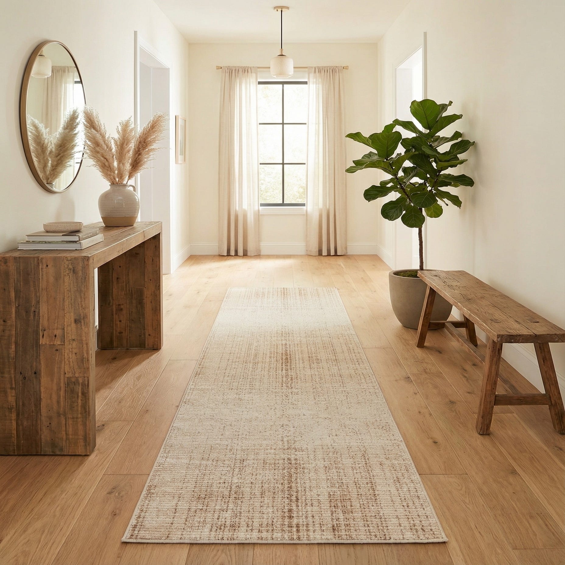 A 12 ft runner rug in ivory and cream with a subtle modern textured pattern, ideal for a hallway.
