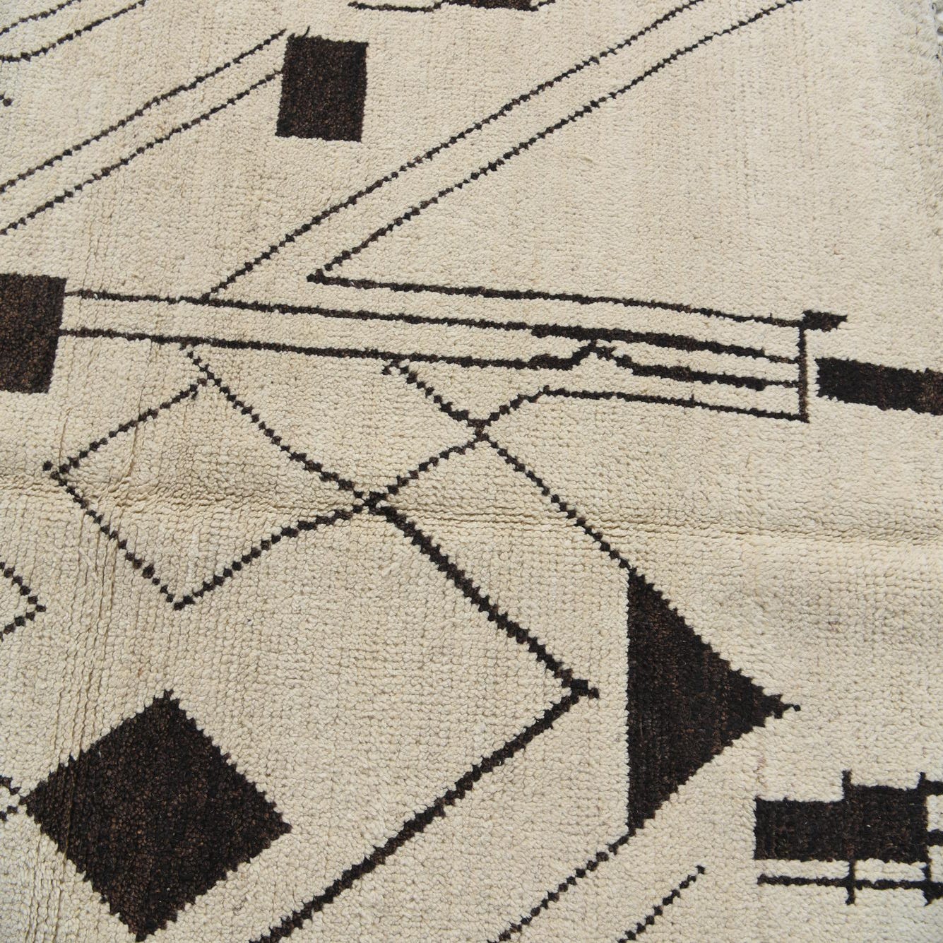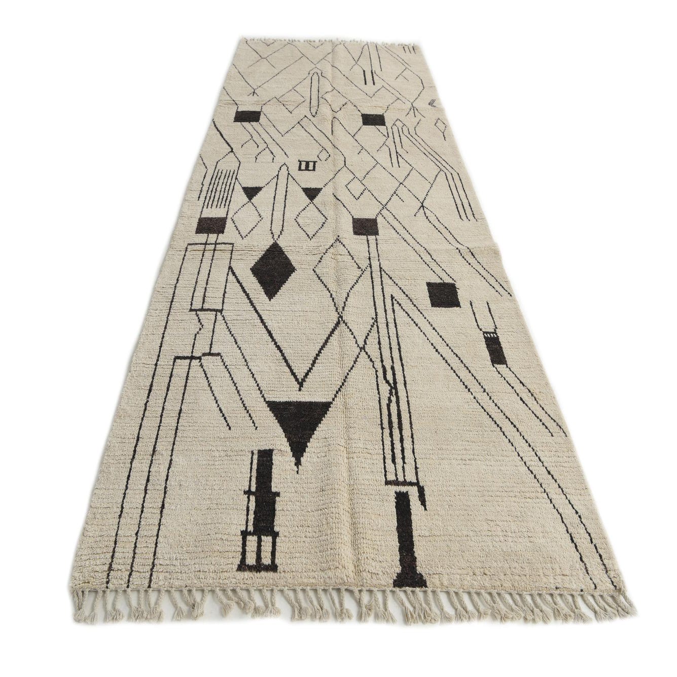 A 12 ft runner rug in ivory wool with a modern tribal abstract pattern in black lines and solid shapes.