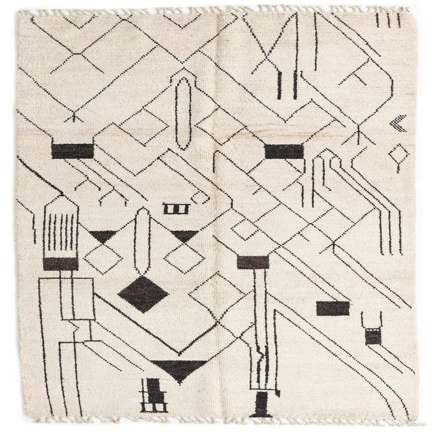 Hand-knotted from 100% wool, this runner presents an ivory field punctuated by black linear motifs—diamonds, lozenges, intersecting lines and small solid blocks—arranged in an asymmetrical, hand-drawn layout. The freehand quality of the lines and the hand-tied fringe at each end give the piece a relaxed, handcrafted character. Running your hand across the surface reveals a dense, slightly springy wool pile with subtle surface variation where the knots form the pattern, so the motifs hold crisp definition against the soft ivory ground.