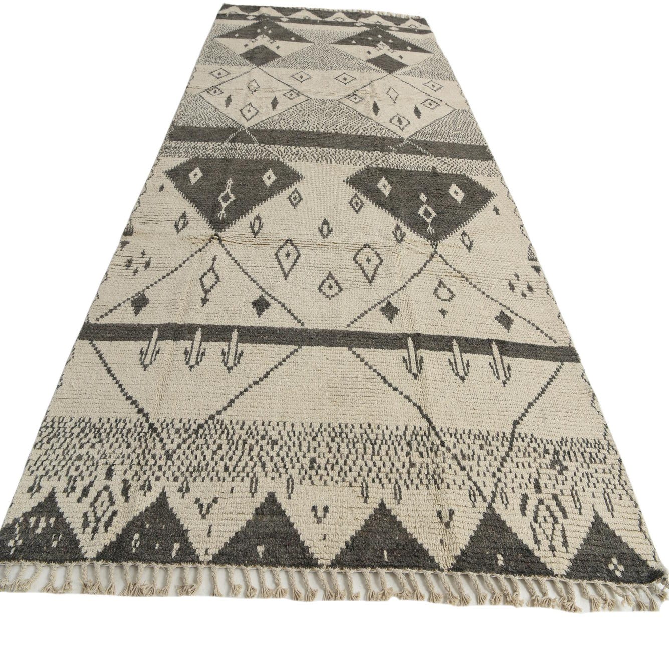 This Moroccan collection 12-ft runner is a testament to skilled craftsmanship, hand-knotted from 100% wool for a textured, durable finish. The rug boasts an ivory background with a tasteful array of gray geometric patterns and symbols that lend it a tribal-inspired aesthetic. The design features a series of diamond and chevron shapes, punctuated by linear elements and small motif accents, which create an engaging visual rhythm across the runner's length. The presence of fringe at the ends adds a traditional touch.