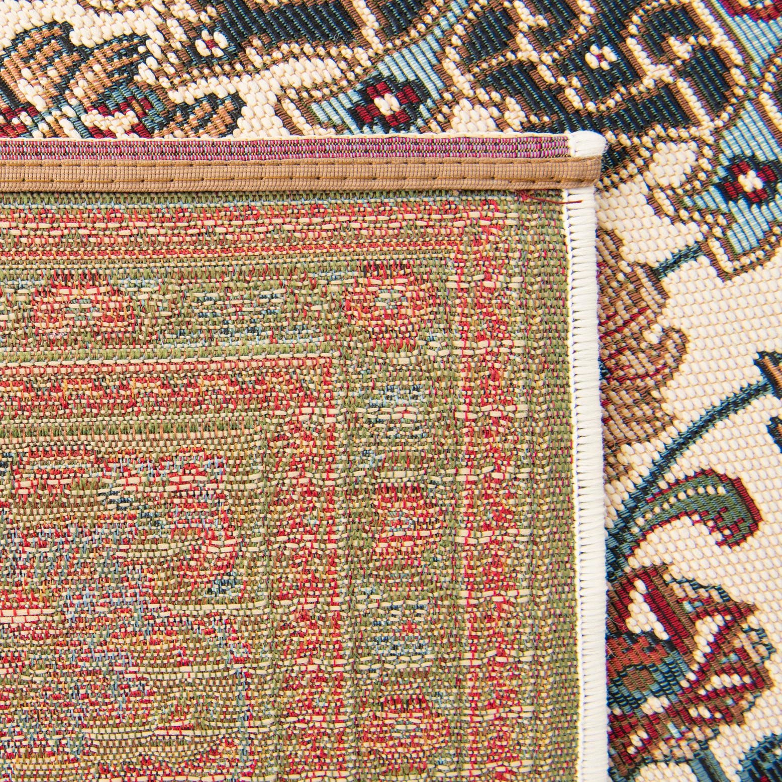 A 12 ft ivory runner rug with a traditional oriental medallion pattern in reds, blues, and browns, ideal for a hallway or patio.