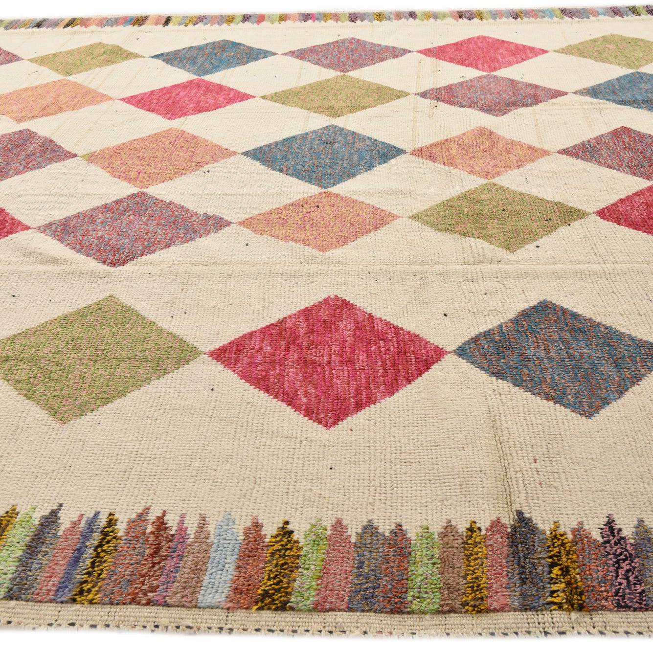A large 12x15 rectangular ivory shag rug featuring colorful diamond patterns in pink, blue, orange, and green, with striped borders and fringe.