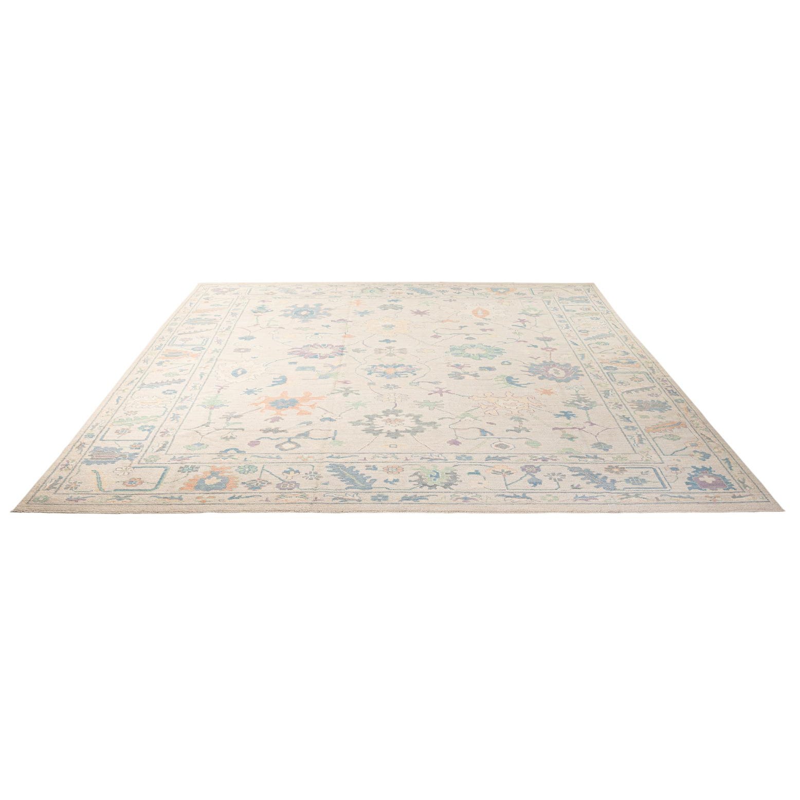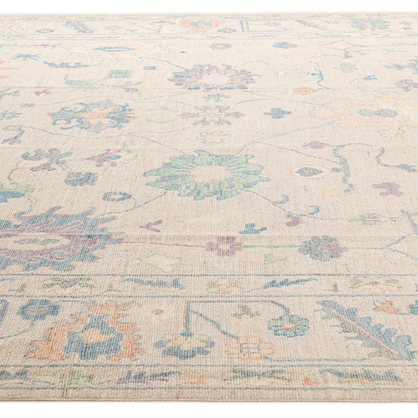 A large 12x15 rectangular ivory wool rug with a modern floral Oushak pattern in muted blues, greens, purples, and oranges.