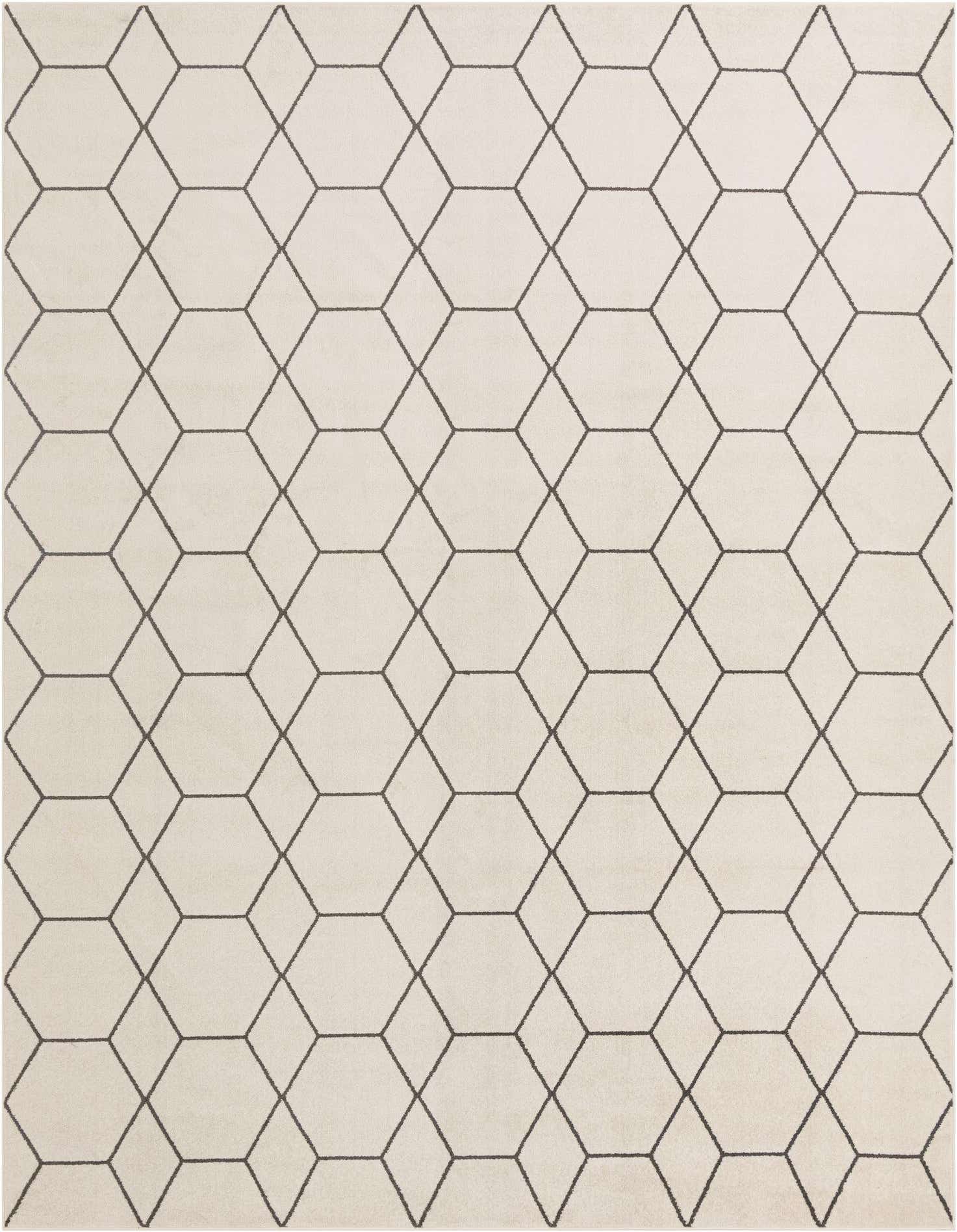 A clean geometric lattice of interlocking hexagons is set against an ivory field, with slim gray lines tracing each shape to produce a refined, slightly dimensional pattern. The palette stays neutral while the repeating geometry brings a contemporary, architectural feel to the floor. Machine-made of 100% polypropylene, the rug has a low-pile, smooth surface that lays flat and feels soft underfoot.
