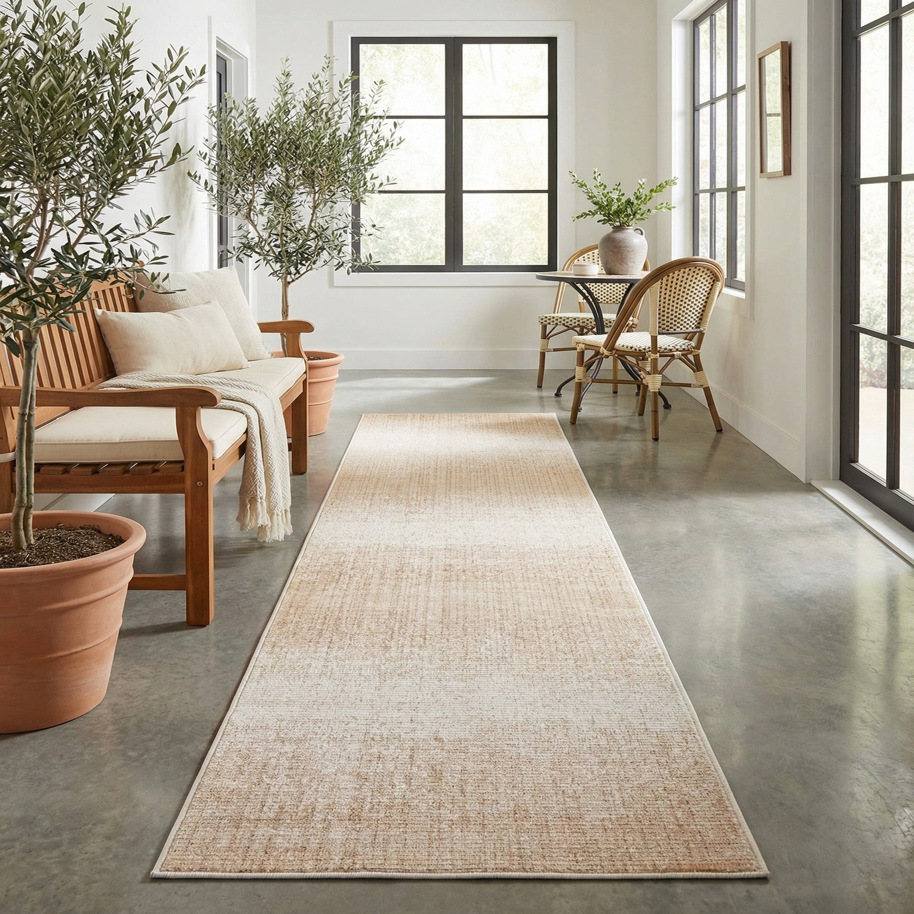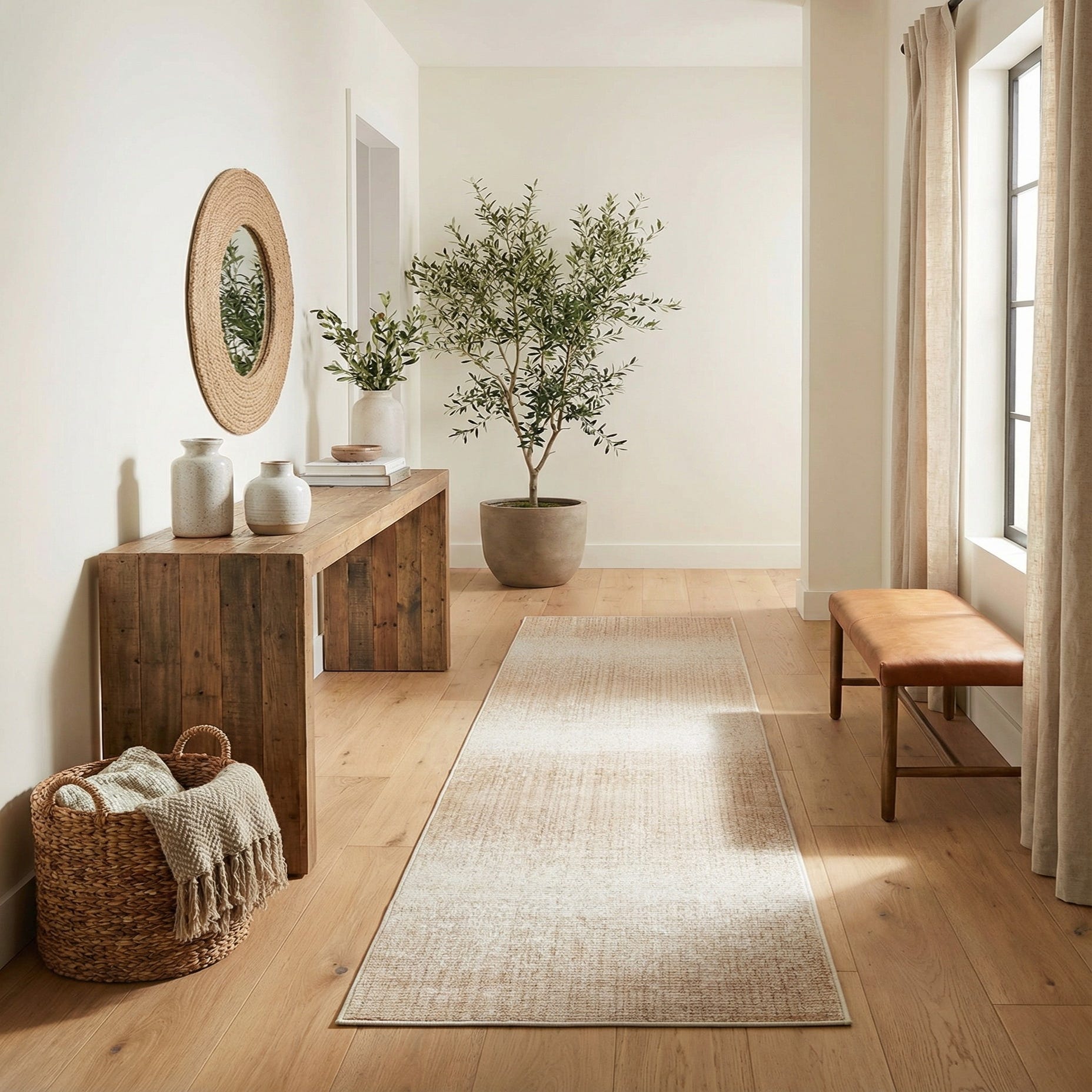 A long, rectangular 13 ft runner rug in shades of ivory and cream with a subtle textured pattern, ideal for hallways.