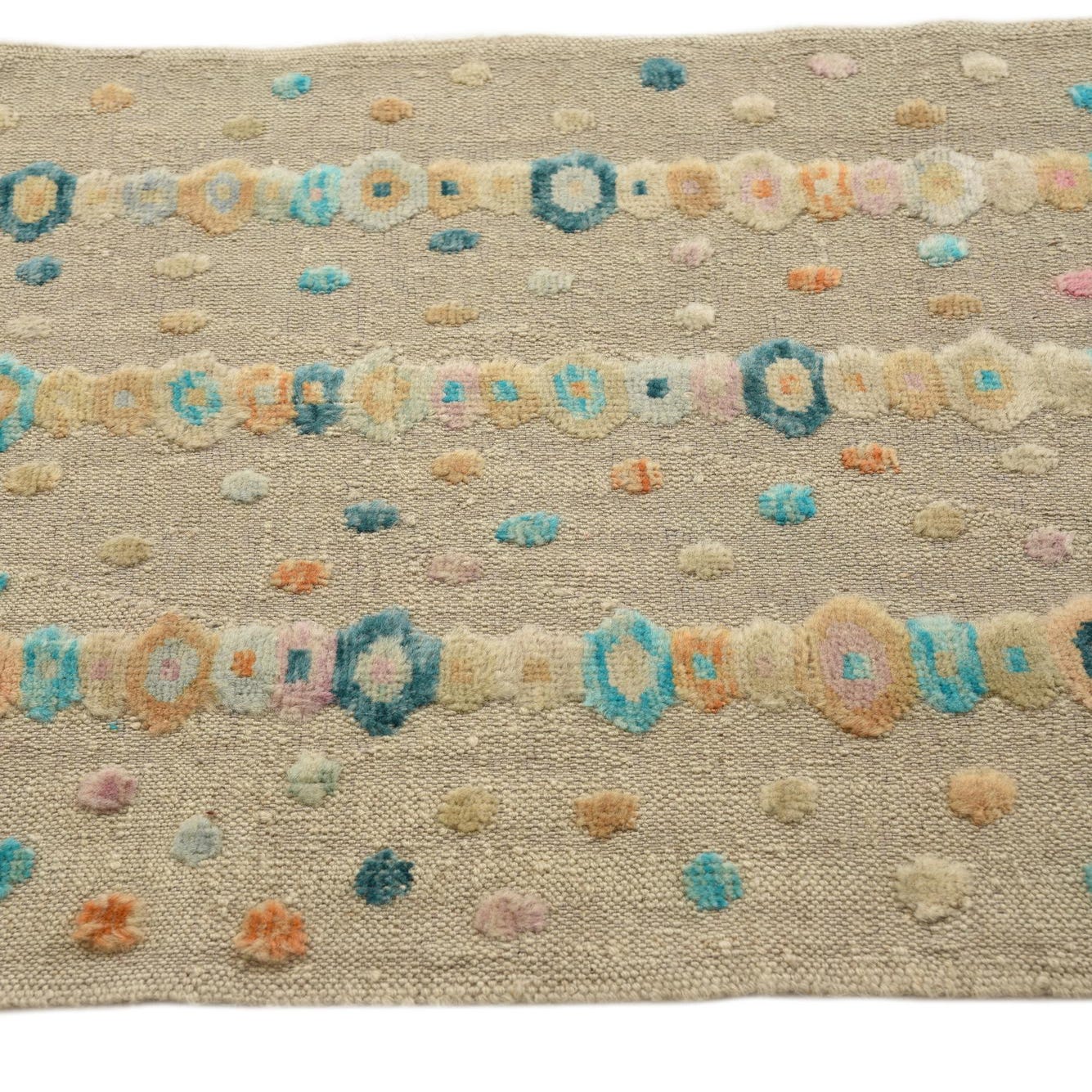 A 13 ft runner rug with an ivory background, featuring vertical stripes of colorful abstract tribal patterns in teal, orange, pink, and brown.