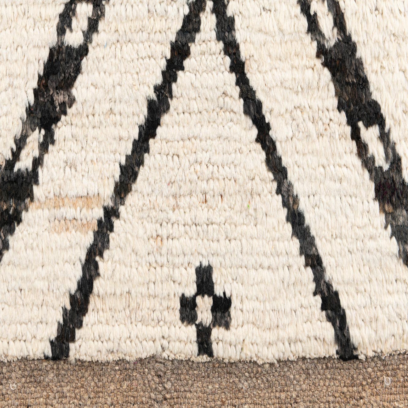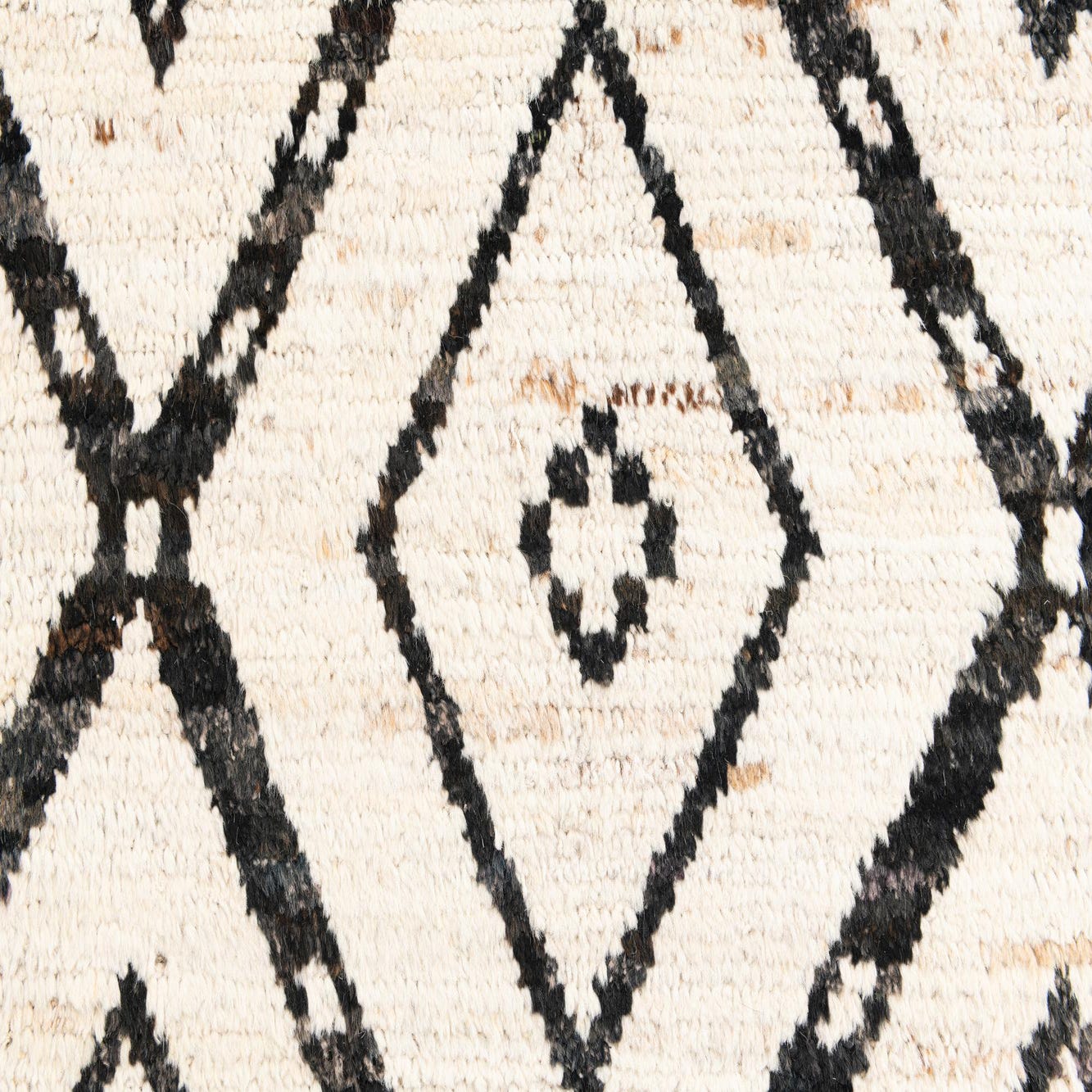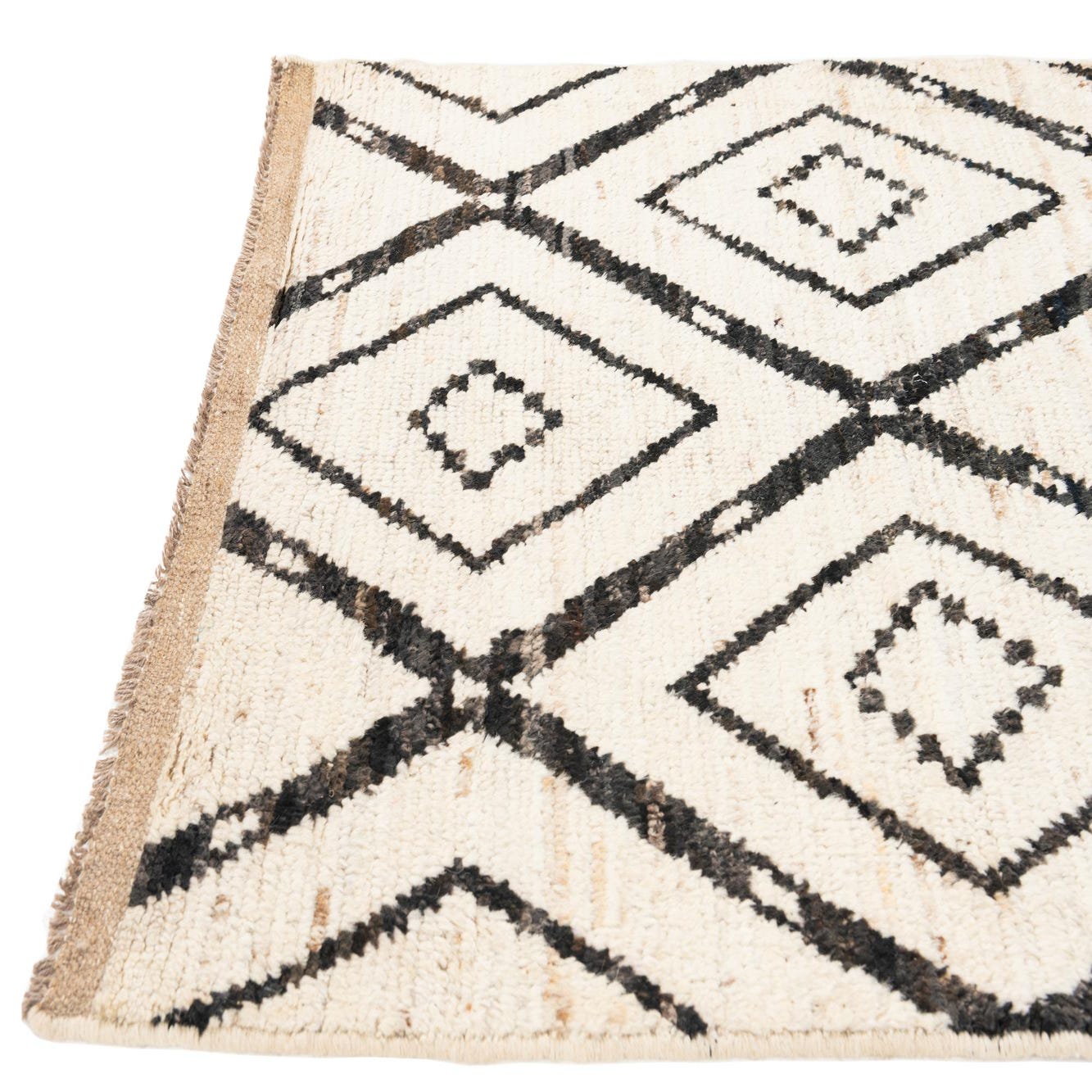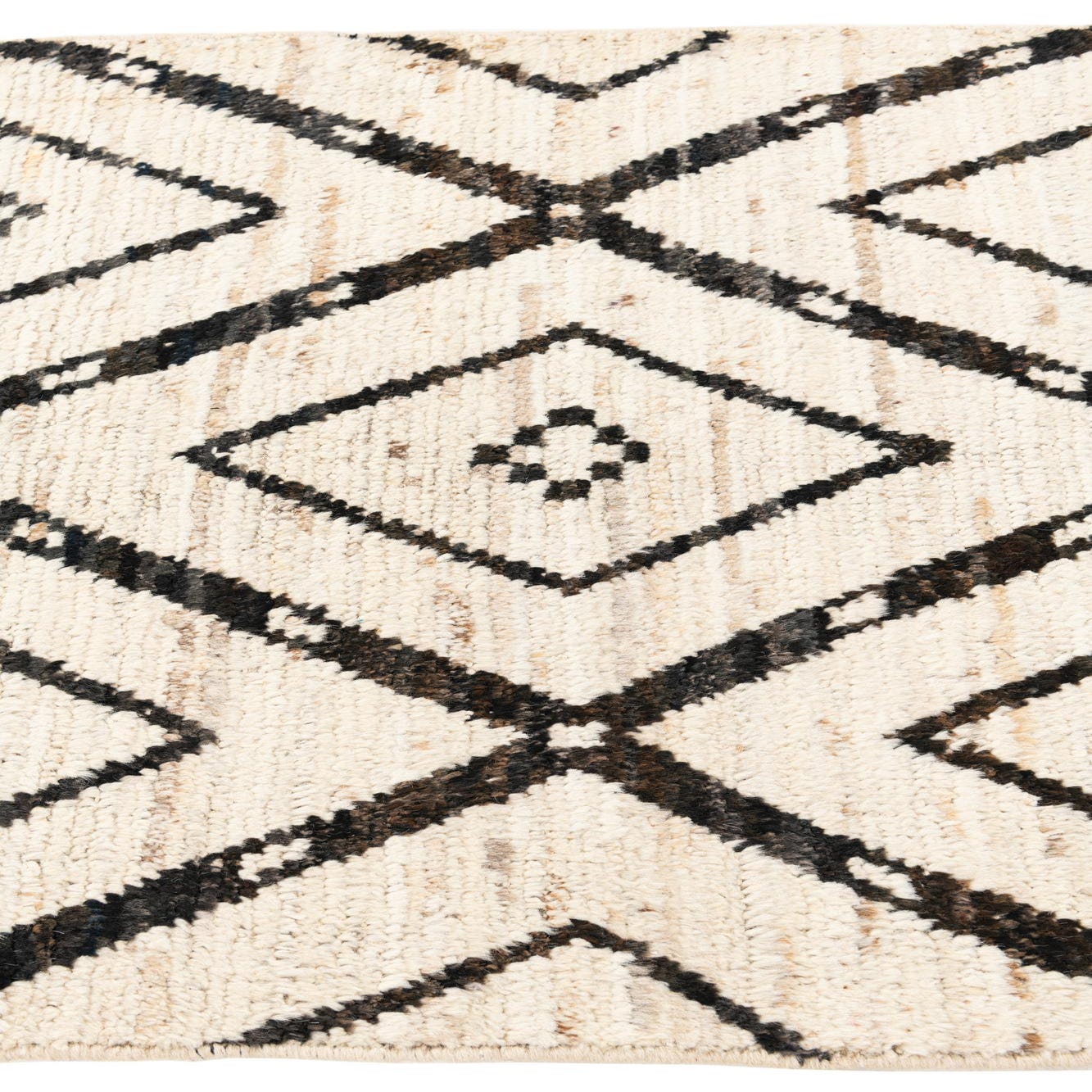 A 13 ft runner rug featuring an ivory and cream shag pile with a bold black tribal diamond pattern, perfect for a hallway.