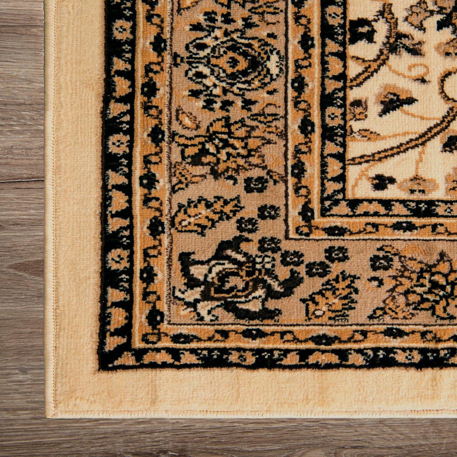 An ivory field sets the stage for a classic, Persian-inspired runner of scrolling vines and floral medallions. Beige, cream and tan tones layer across the surface while deeper brown and black accents define the intricate motifs and the decorative border. Machine made from 100% polypropylene, the pile has a low, dense profile that reads the pattern clearly and feels pleasantly soft underfoot, with subtle textural contrast where the motifs are slightly raised.