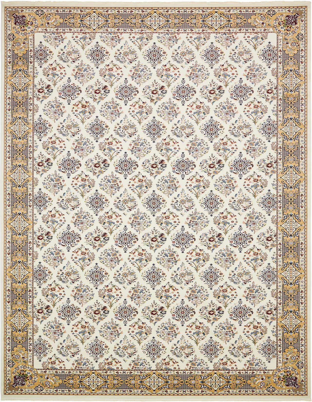 Primary color is Ivory. Colors in this rug include: Ivory, Beige, Blue, Burgundy, Cream, Green, Navy Blue, Puce.