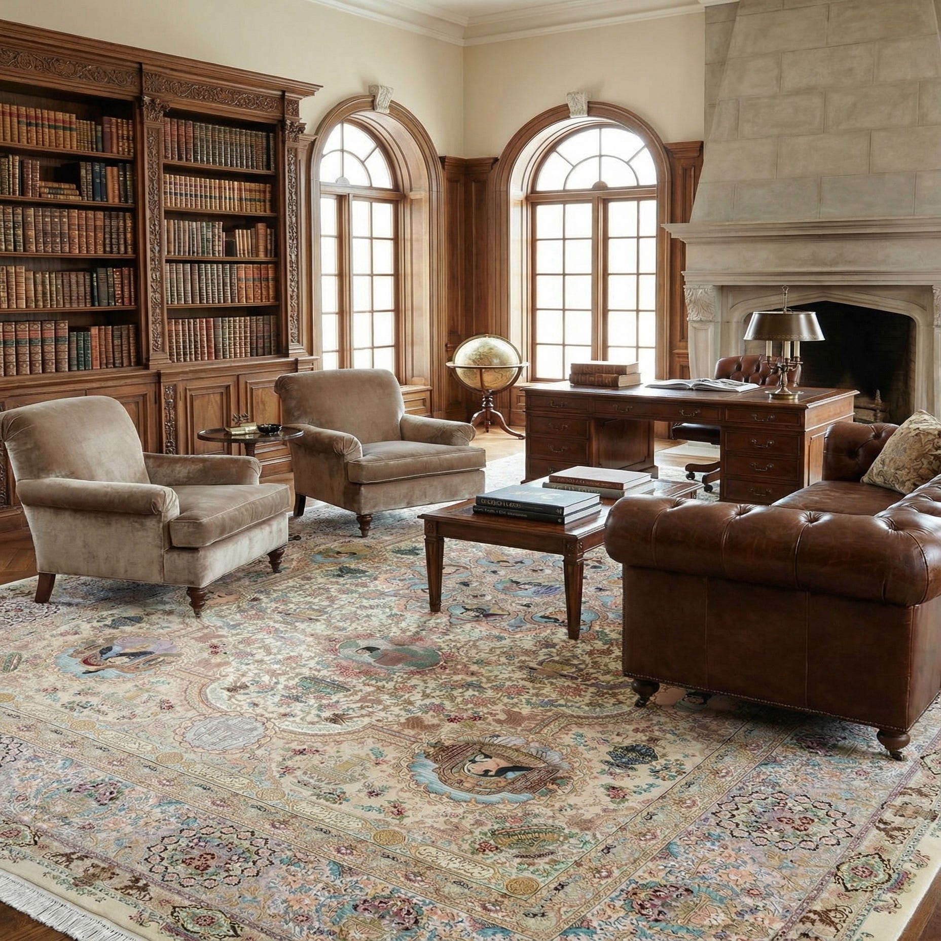 A large 13x18 rectangular ivory Persian rug with a detailed traditional medallion pattern and intricate floral and figural motifs in muted pastel colors.